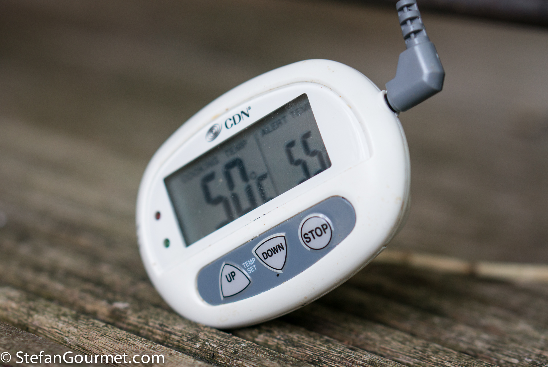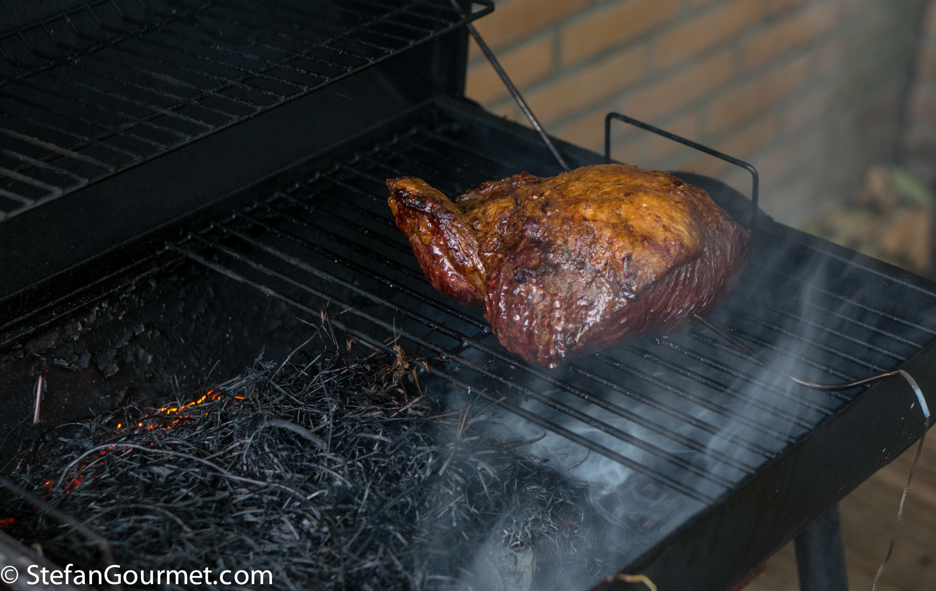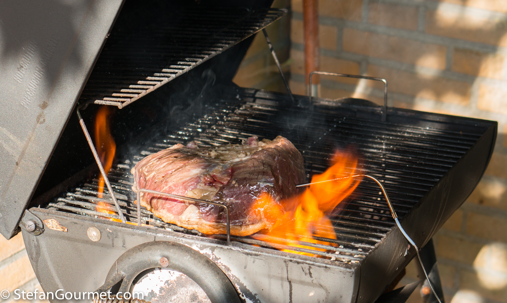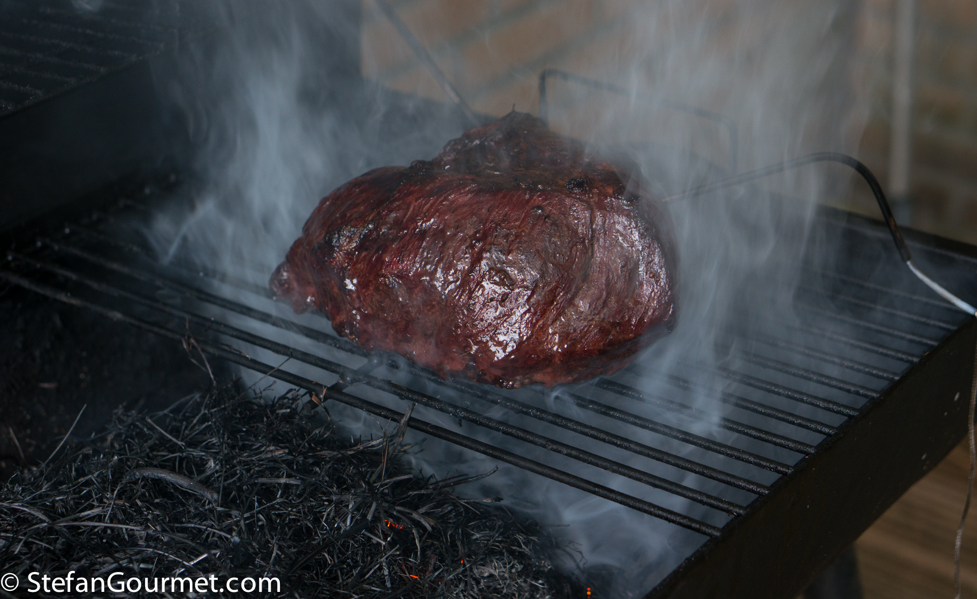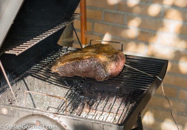 On the grill a charcoal fire was prepared, with only half of the surface covered by charcoal so both direct and indirect heat are available. I inserted the probe of a digital thermometer into the center of the meat, and seared the meat on the outside directly over the coals.