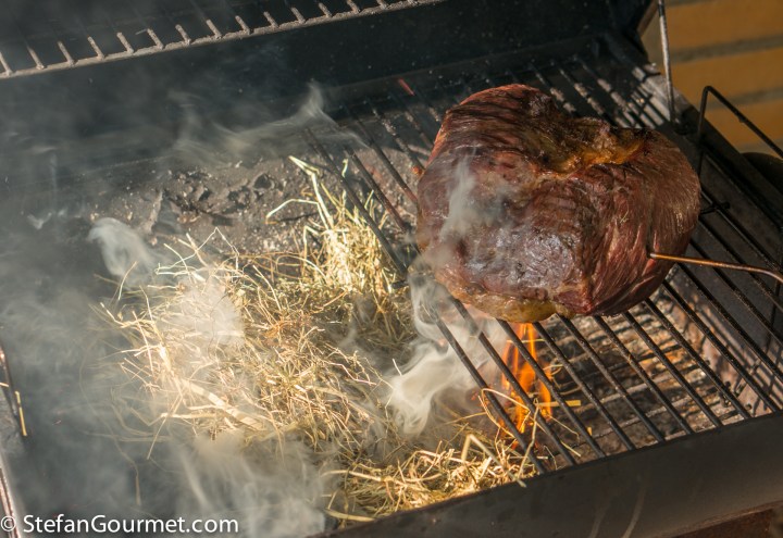 The popularity of picanha as a cut of beef to be prepared on the grill (BBQ) hails from Brazil, and that is why the cut is known under its Brazilian (Portuguese) name. It is called rump cover or rump cap in English, or staartstuk in Dutch. It has a triangular shape and is covered by a layer of fat. I use a number of techniques to give it a wonderful smoky flavor as well as serve it tender and medium rare from edge to edge. First I ‘warm age‘ the meat to tenderize it (this step is not needed when the meat has already been dry aged). This also speeds up the cooking on the grill, so the inside will be cooked before the outside is overcooked. After searing the outside on a charcoal grill, I put hay on the coals to generate a lot of smoke. The grill is then closed and the meat is smoked until it reaches the desired core temperature.