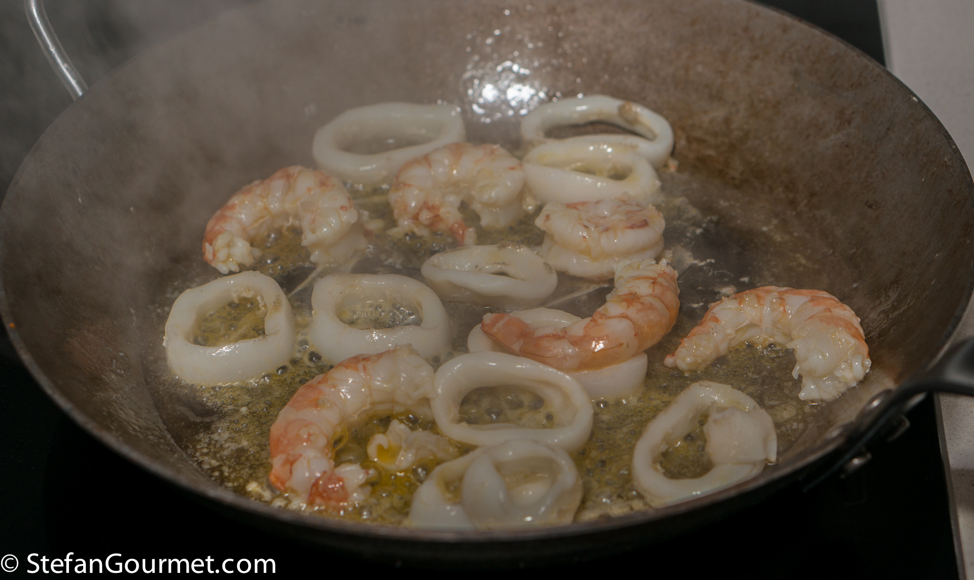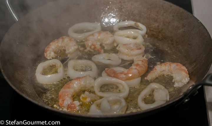 Peel the shrimp, reserving heads and shells. Cut the squid into rings. Sauté the squid and shrimp for 1 minute in 2 tablespoons of olive oil over high heat.