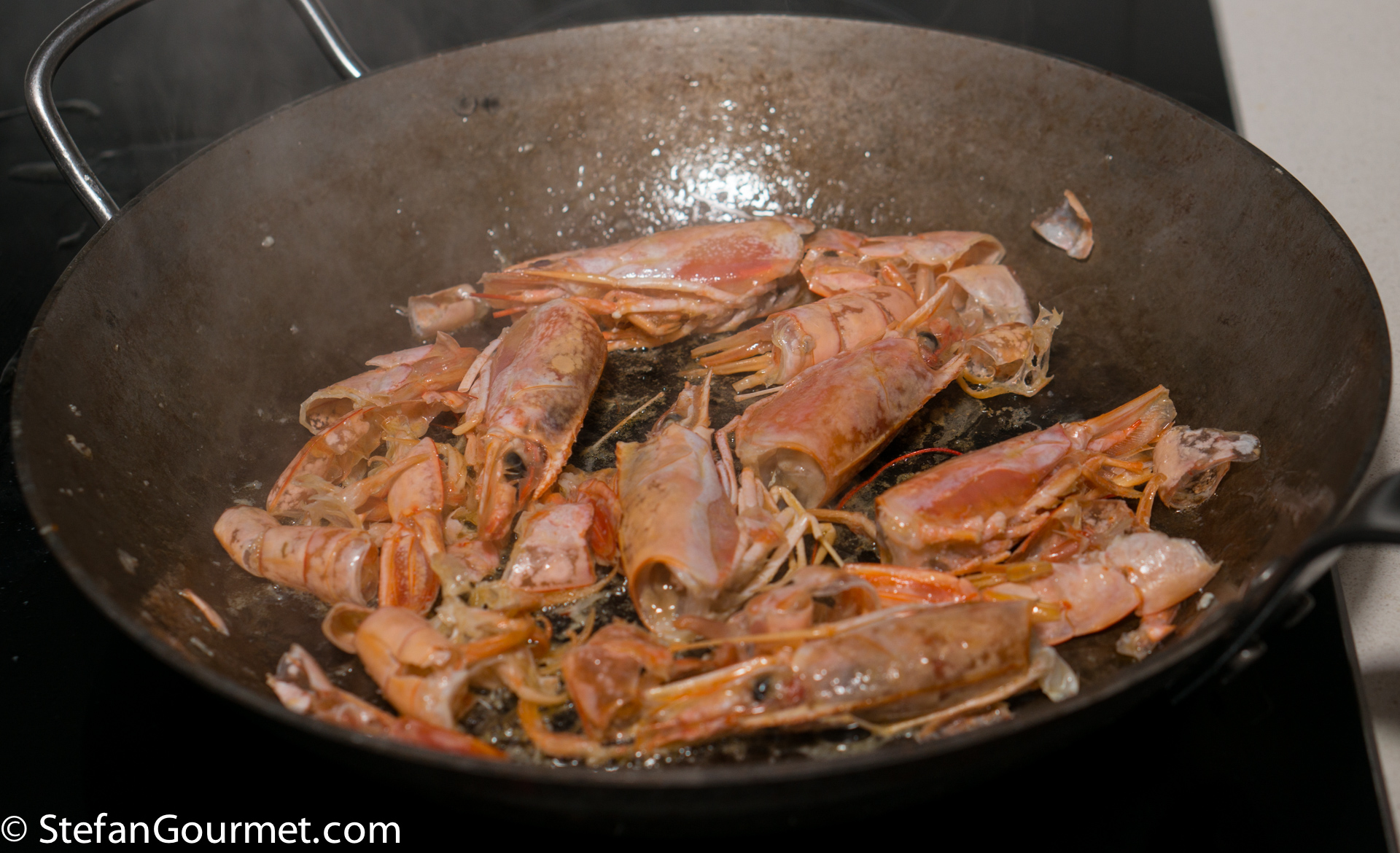 Add the reserved shrimp heads and shells to the pan, and stir them briefly over high heat.