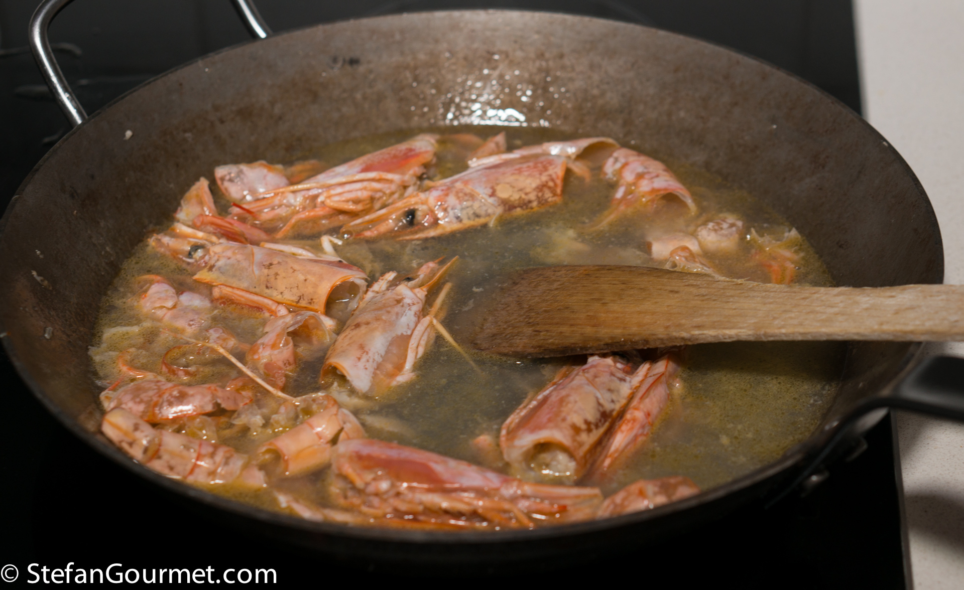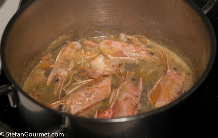 Use a chinois and a pestle to push as much liquid out of the shrimp heads and shells as you can, as there is a lot of flavor in there, and add this to the stock as well.