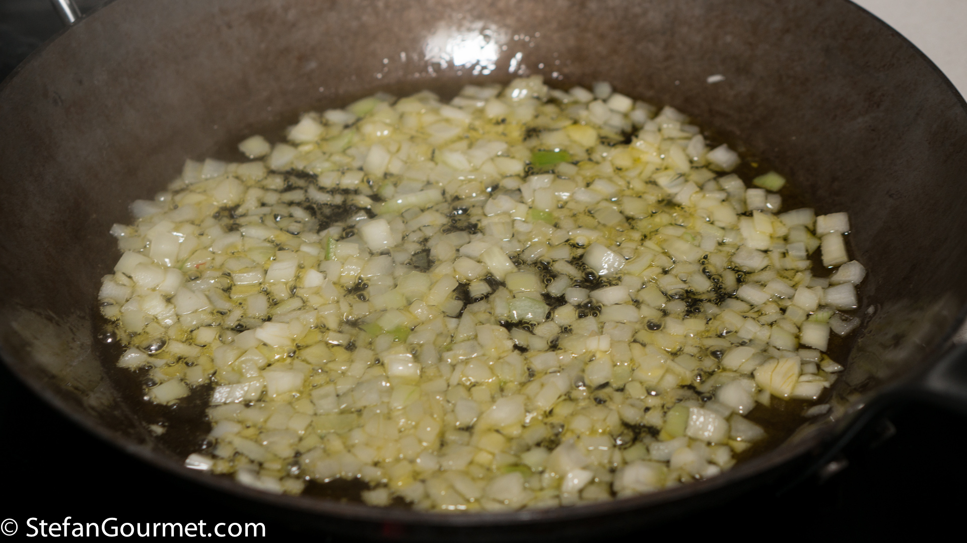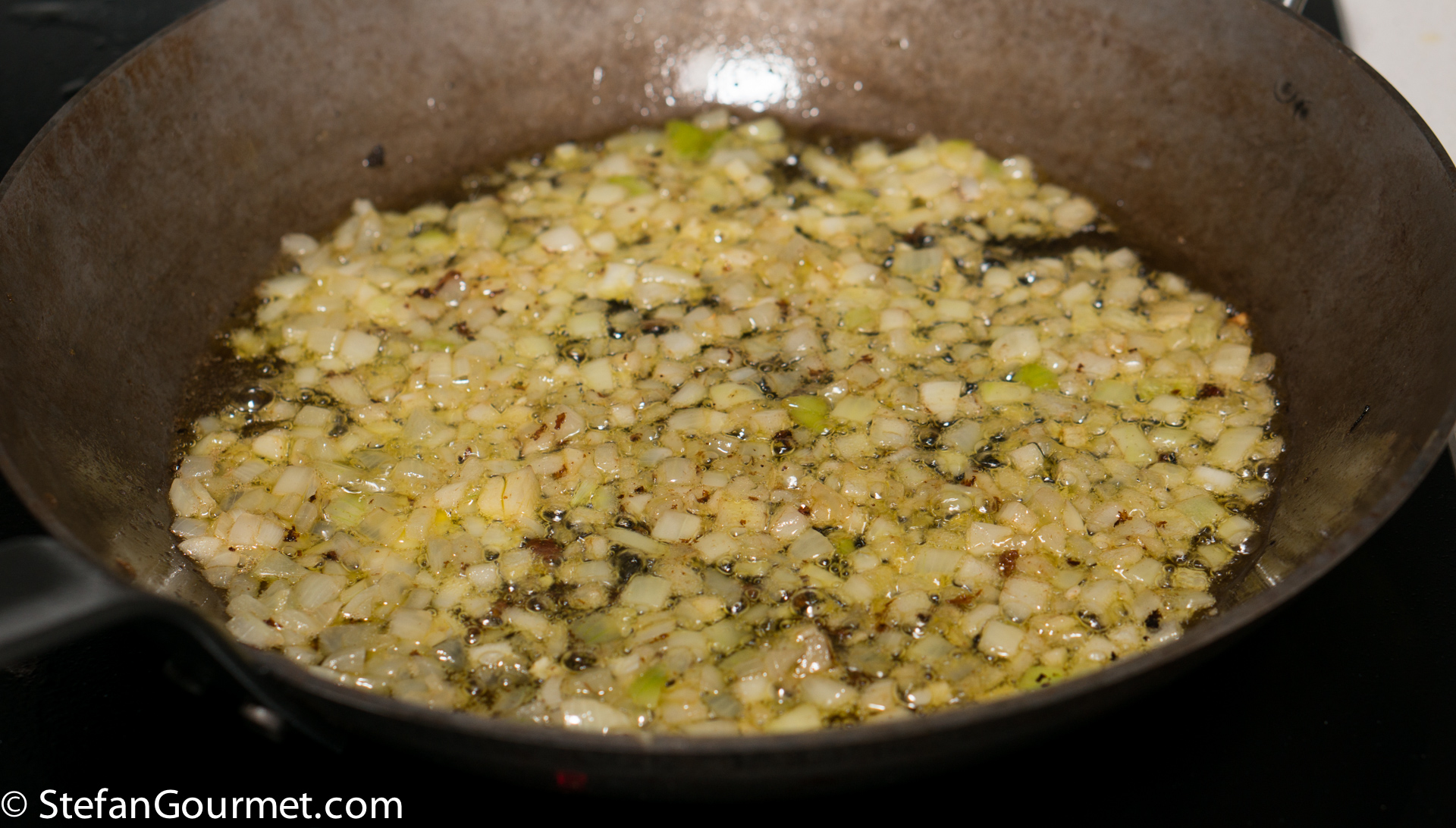 Do not clean the pan, as the seafood drippings that were left behind contain a lot of flavor.