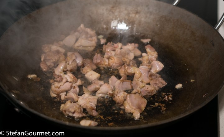 In the meantime, cut the chicken into pieces and sauté this for 1 minute over high heat in 2 tablespoons of olive oil. You don’t have to cook the chicken through, this step is just about browning the chicken a little to add some flavor.