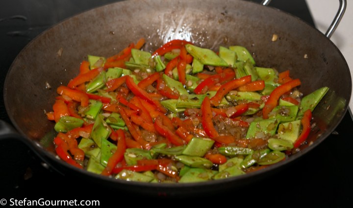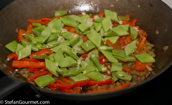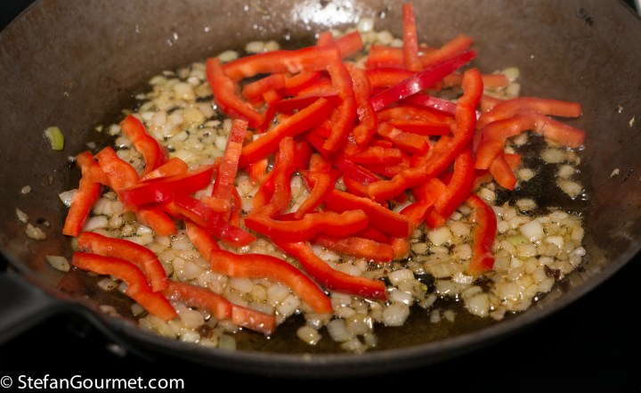 Add the red bell pepper strips and stir for a couple of minutes over medium heat.