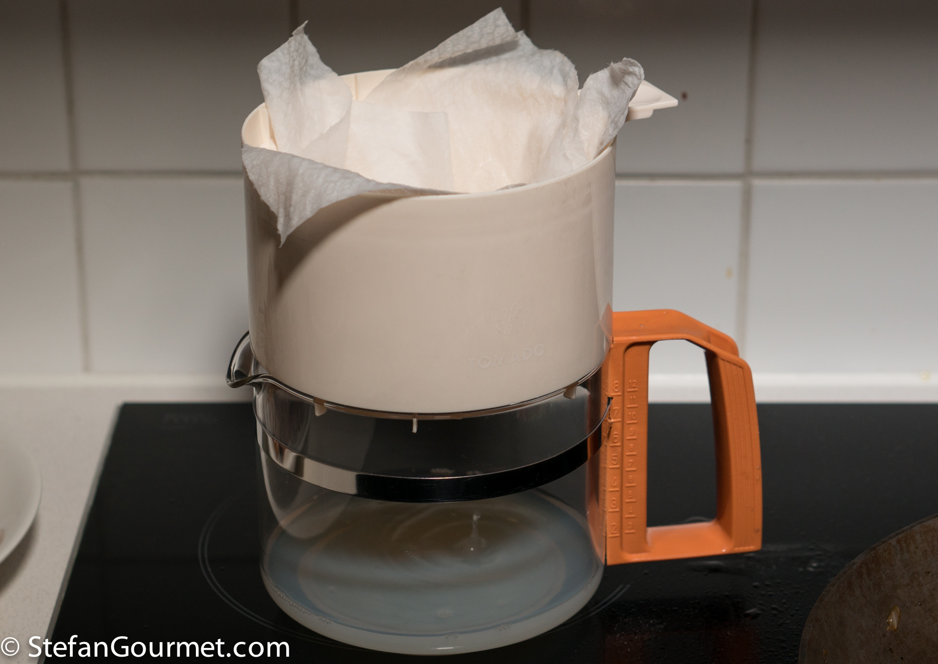 Filter the mussel liquid using kitchen paper. (I like to use an old coffee filter holder for this.) Add the mussel liquid to the chicken stock.