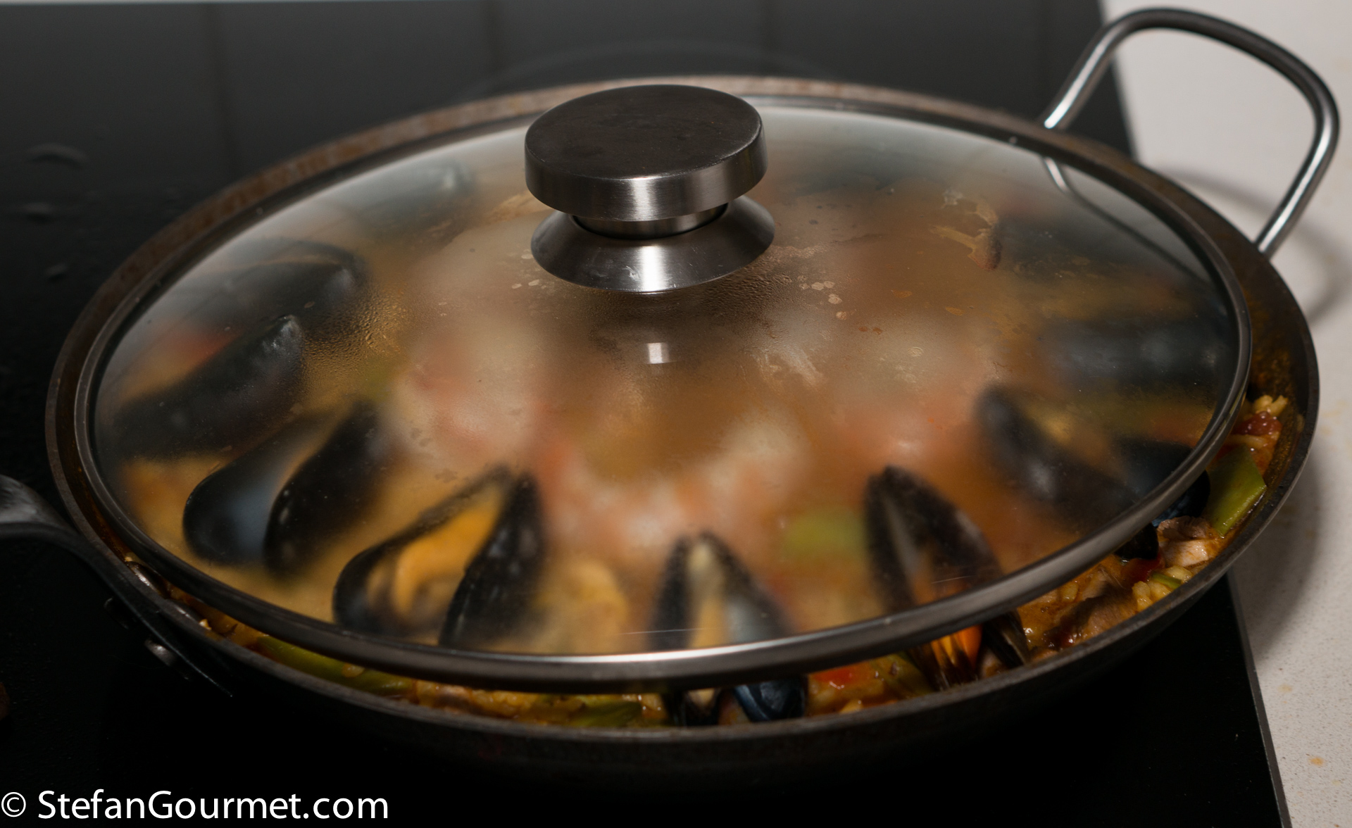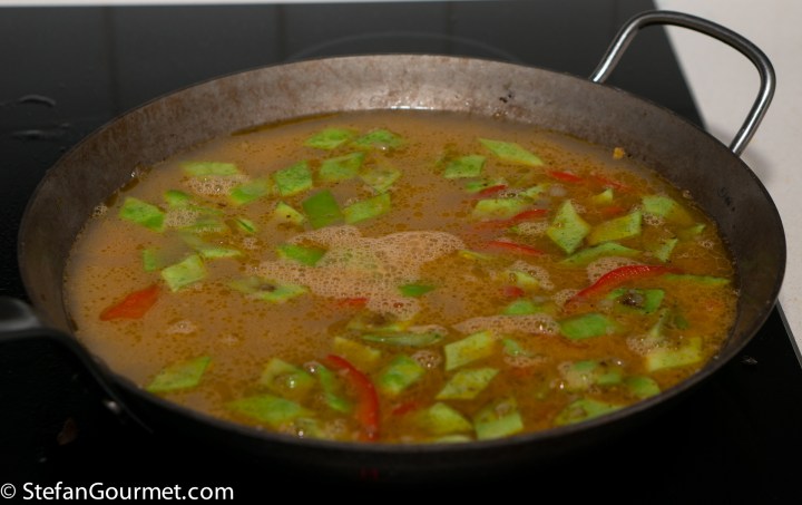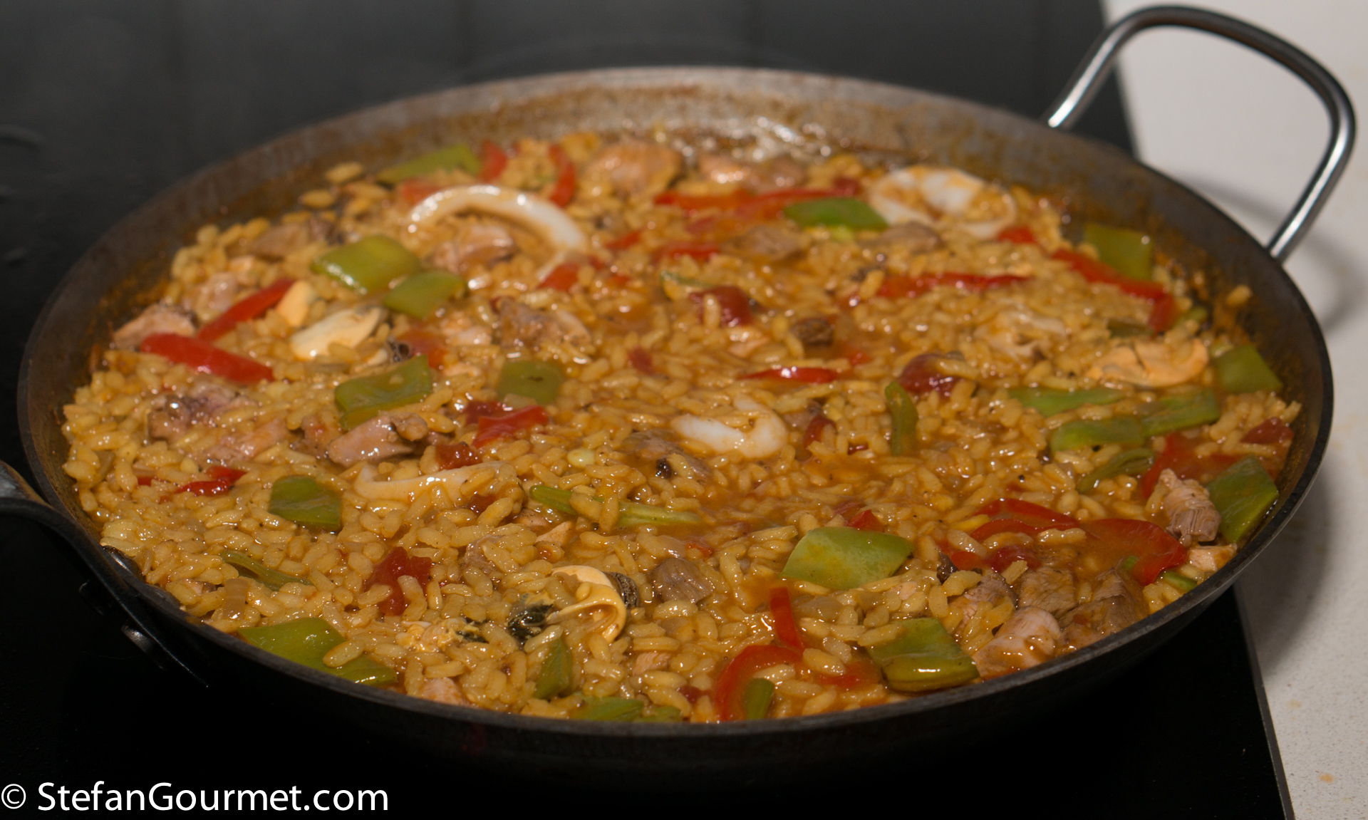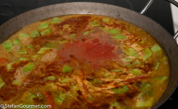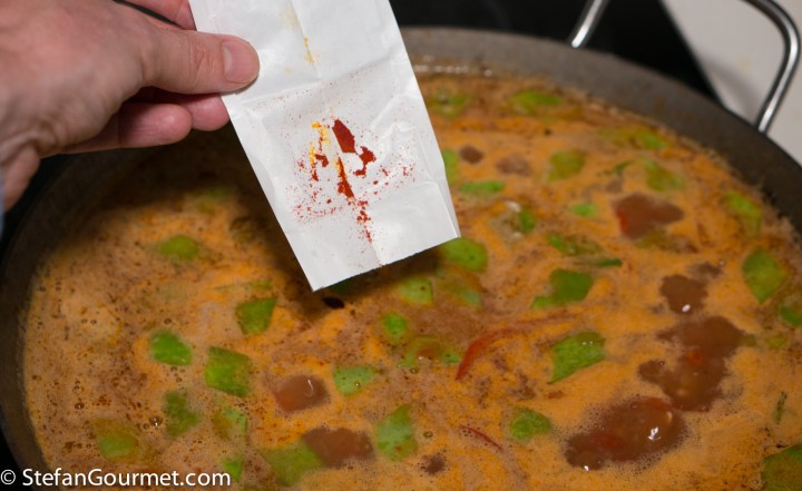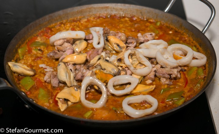 Paella is one of the best known dishes from Spain, although it is really from the Spanish city of Valencia on the Mediterranean coast. The name “paella” simply means “pan” in Valencian, although a paella pan is called a “paellera” in Spanish. There are many versions of paella, some more authentic than others, which is why Valencians think those other dishes should be called “arroz con cosas” (rice with stuff). The main versions are Paella Valenciana (meat paella with chicken, rabbit, and snails), Paella de Mariscos (seafood paella with shrimp, mussels, squid, scampi, and fish), Paella de Verduras (vegetable paella with runner beans, white beans, and artichokes), and Paella Mixta (mixed paella with meat, seafood, and vegetables). Although there are a lot of variations, chorizo is not considered to be a traditional ingredient, so paella with chorizo would fall under the “arroz con cosas” category. When making paella, the stock is very important, as that is what will flavor the rice. For this mixed paella I have also used a mixed stock: chicken stock, shrimp stock, and mussel cooking liquid. Paella was traditionally colored with saffron, but nowadays it is often substituted by food coloring because saffron has become so expensive. Luckily I just returned from Italy, where powdered saffron is still affordable.