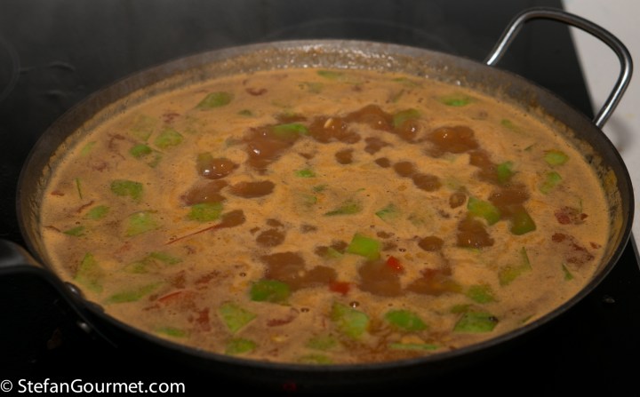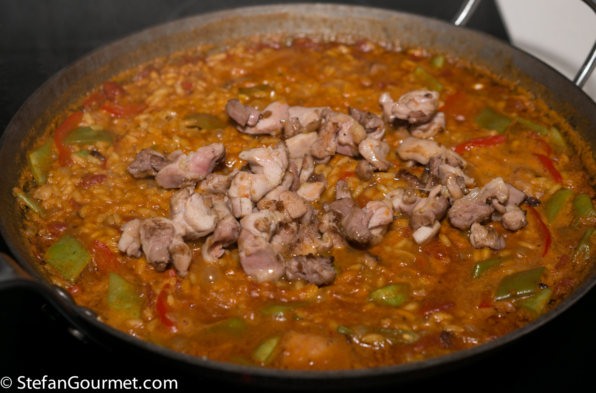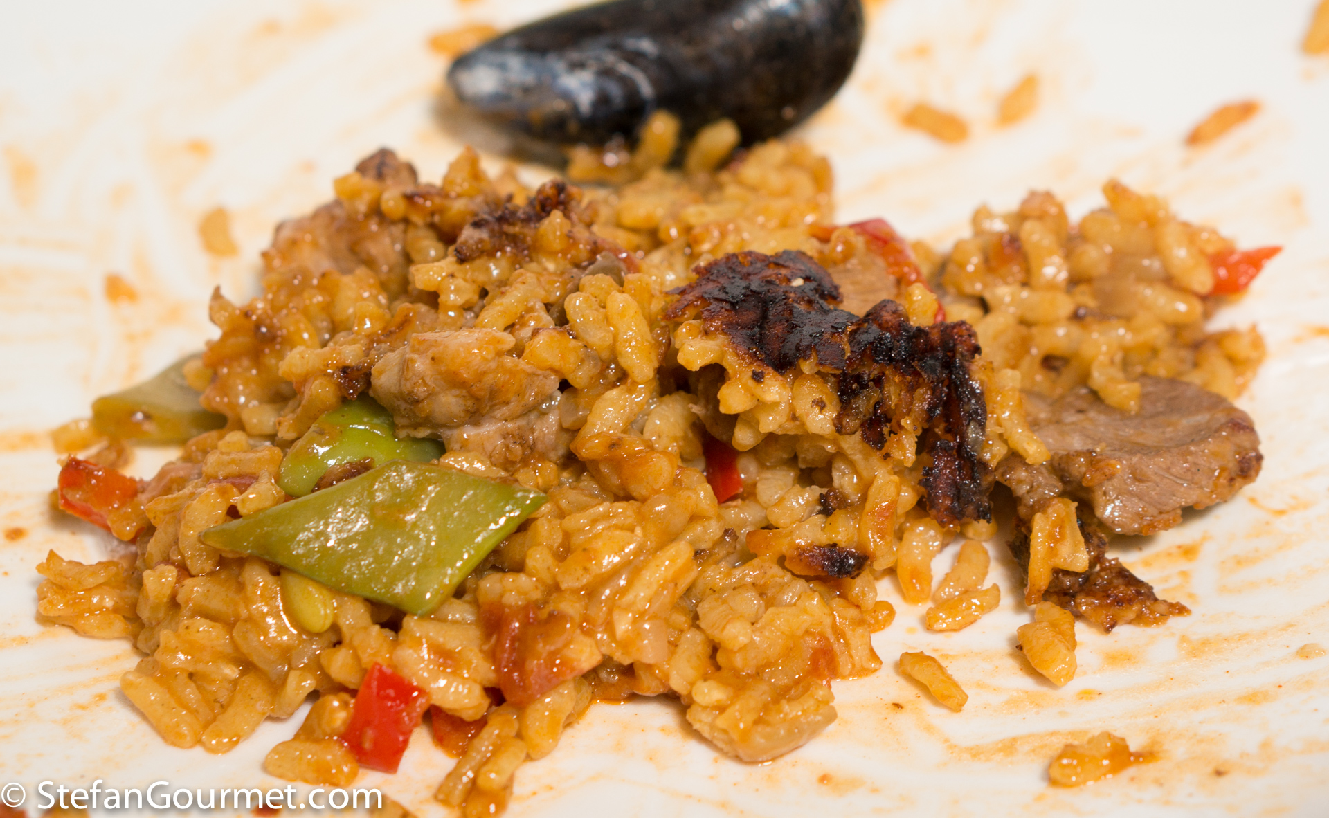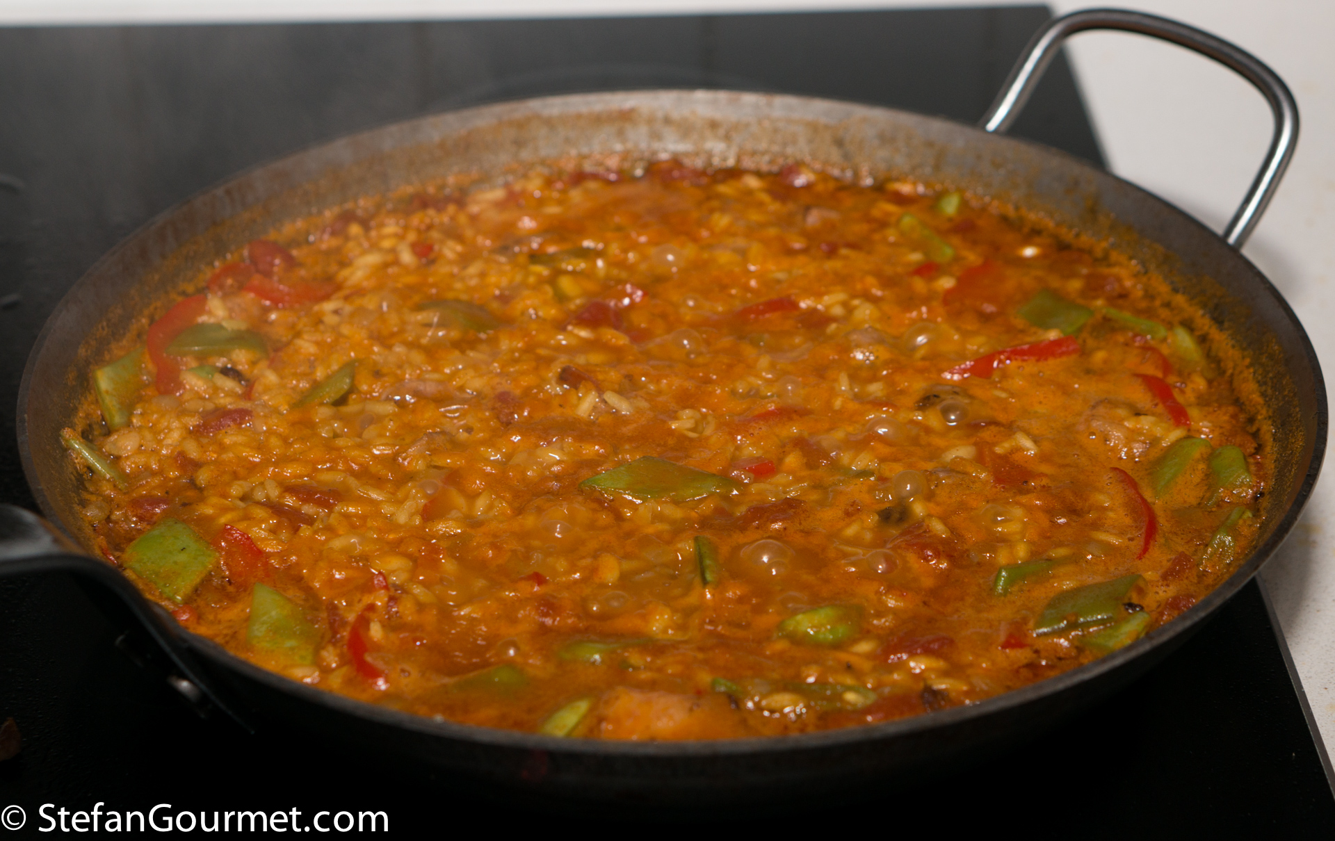 Paella is one of the best known dishes from Spain, although it is really from the Spanish city of Valencia on the Mediterranean coast. The name “paella” simply means “pan” in Valencian, although a paella pan is called a “paellera” in Spanish. There are many versions of paella, some more authentic than others, which is why Valencians think those other dishes should be called “arroz con cosas” (rice with stuff). The main versions are Paella Valenciana (meat paella with chicken, rabbit, and snails), Paella de Mariscos (seafood paella with shrimp, mussels, squid, scampi, and fish), Paella de Verduras (vegetable paella with runner beans, white beans, and artichokes), and Paella Mixta (mixed paella with meat, seafood, and vegetables). Although there are a lot of variations, chorizo is not considered to be a traditional ingredient, so paella with chorizo would fall under the “arroz con cosas” category. When making paella, the stock is very important, as that is what will flavor the rice. For this mixed paella I have also used a mixed stock: chicken stock, shrimp stock, and mussel cooking liquid. Paella was traditionally colored with saffron, but nowadays it is often substituted by food coloring because saffron has become so expensive. Luckily I just returned from Italy, where powdered saffron is still affordable.
