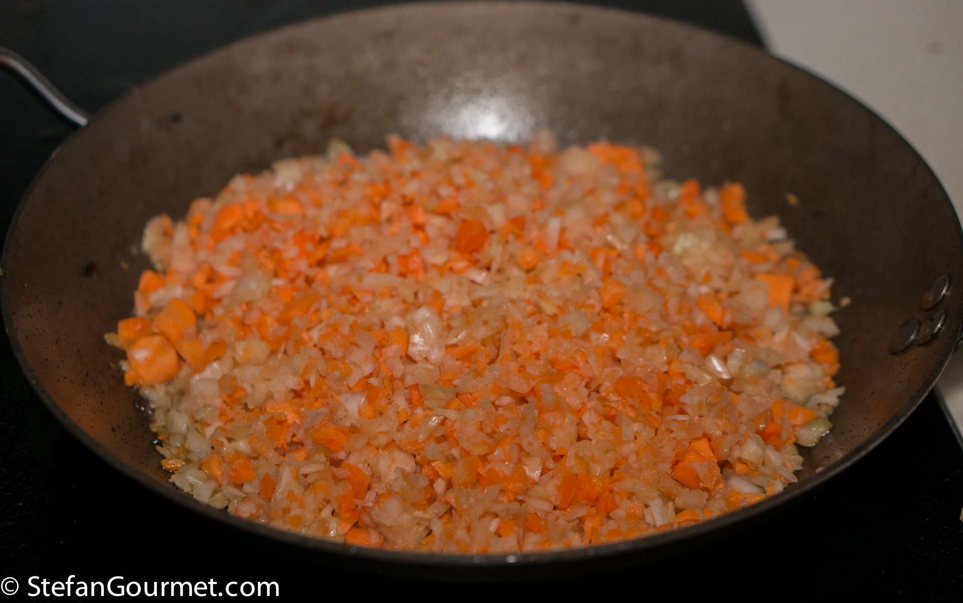 Add the celery, onion, carrot, and garlic to the drippings left in the pan. Season with salt.
