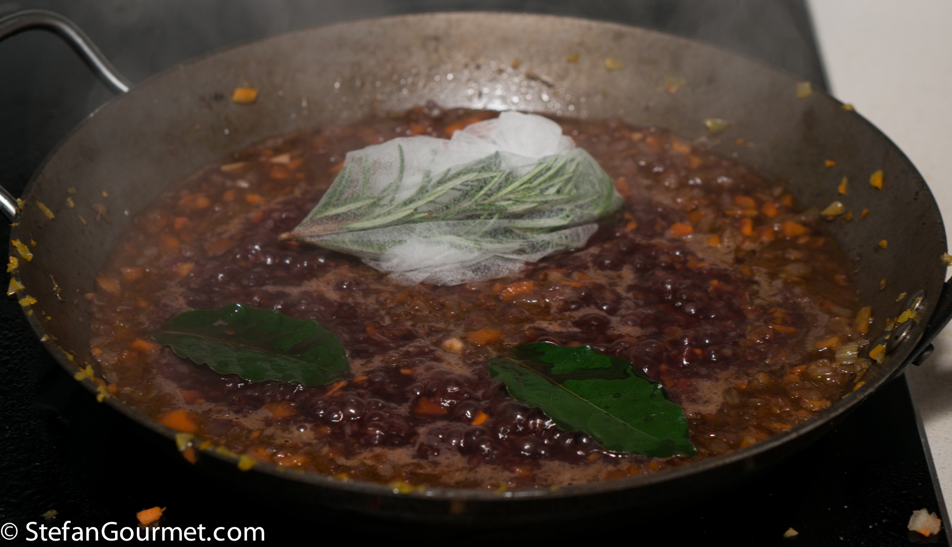 Add 2 bay leaves, 6 cloves, and a sprig of rosemary. You will have to fish them out later, so it is easy to wrap the rosemary (and possibly also the cloves) in muslin (I used a disposable hairnet). Bring to a boil, then reduce the heat to medium, and cook until the wine has been reduced by half, 5 to 10 minutes.