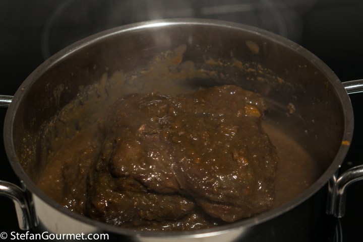 Turn off the heat and reheat the outside of the meat in the sauce for a couple of minutes.