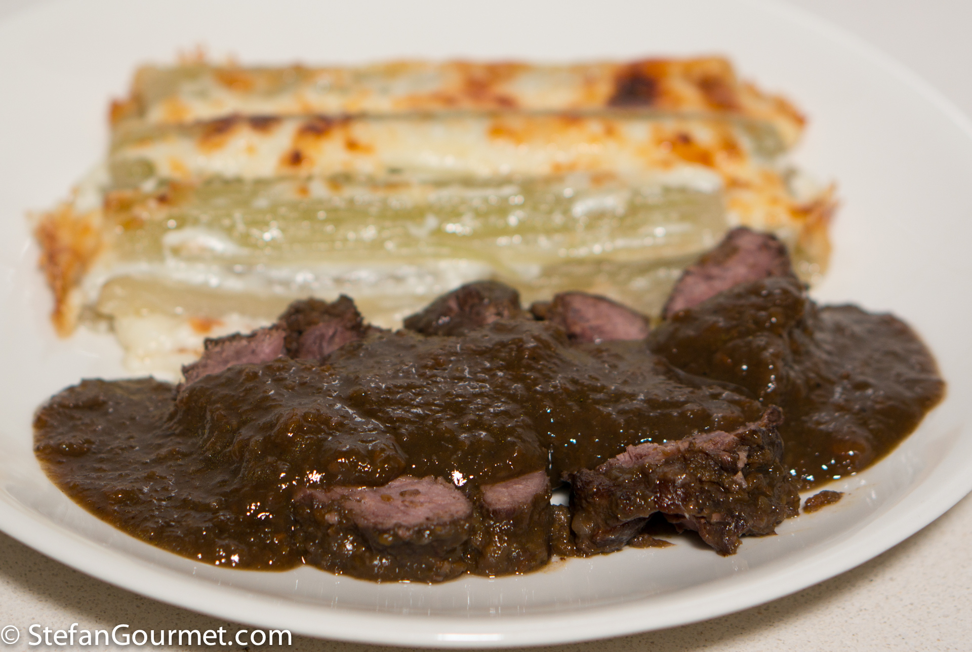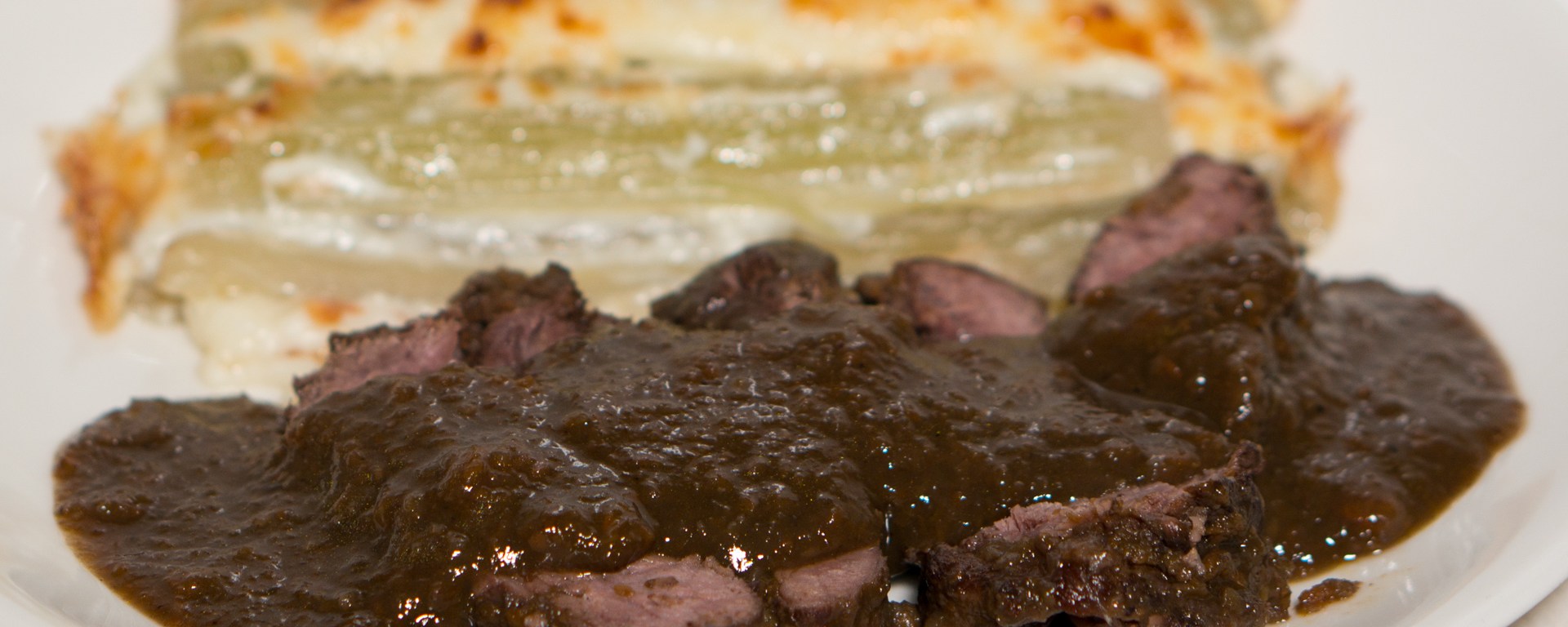 This way of preparing sous-vide braised venison was inspired by a recipe from Piemonte in Italy to braise beef in red wine (or more specifically, in Barolo): Brasato al Barolo. The traditional recipe tells you to marinate the meat in the wine before cooking, but that is not necessary at all if you are going to cook it sous-vide for 24 hours anyway. You can make the same dish on the stovetop or in the oven, but the nice thing about doing it sous-vide is that thanks to the accurate temperature control it will always be tender and never be dry. Traditionally prepared the meat often turns out dry and then it is the delicious sauce (made with red wine, carrot, onion, celery, and stock) that rescues the dish. When you make it sous-vide the sauce will be as delcious, but the meat will be more juicy and tender. This was nice with cardoon gratin as a side and would be a great dish for the holidays. I used neck of venison, but another tough cut like shoulder would also work well.