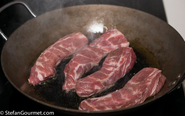 Brown them on all sides to develop the flavor, then put them aside on a plate to cool. Turn off the heat.