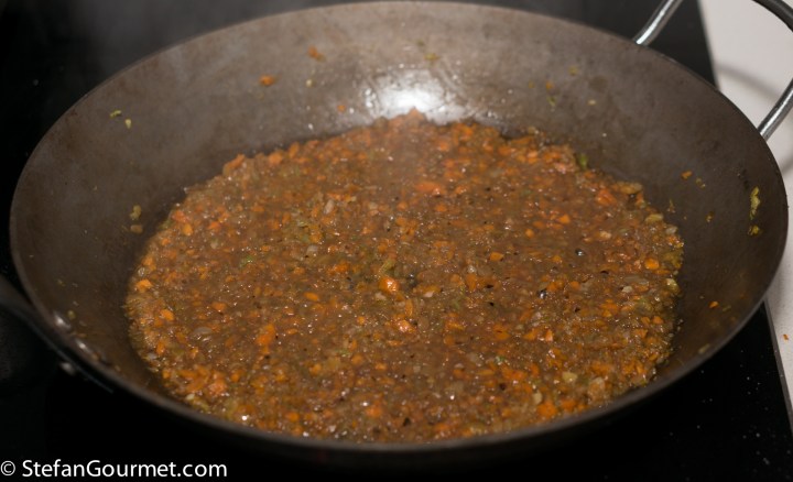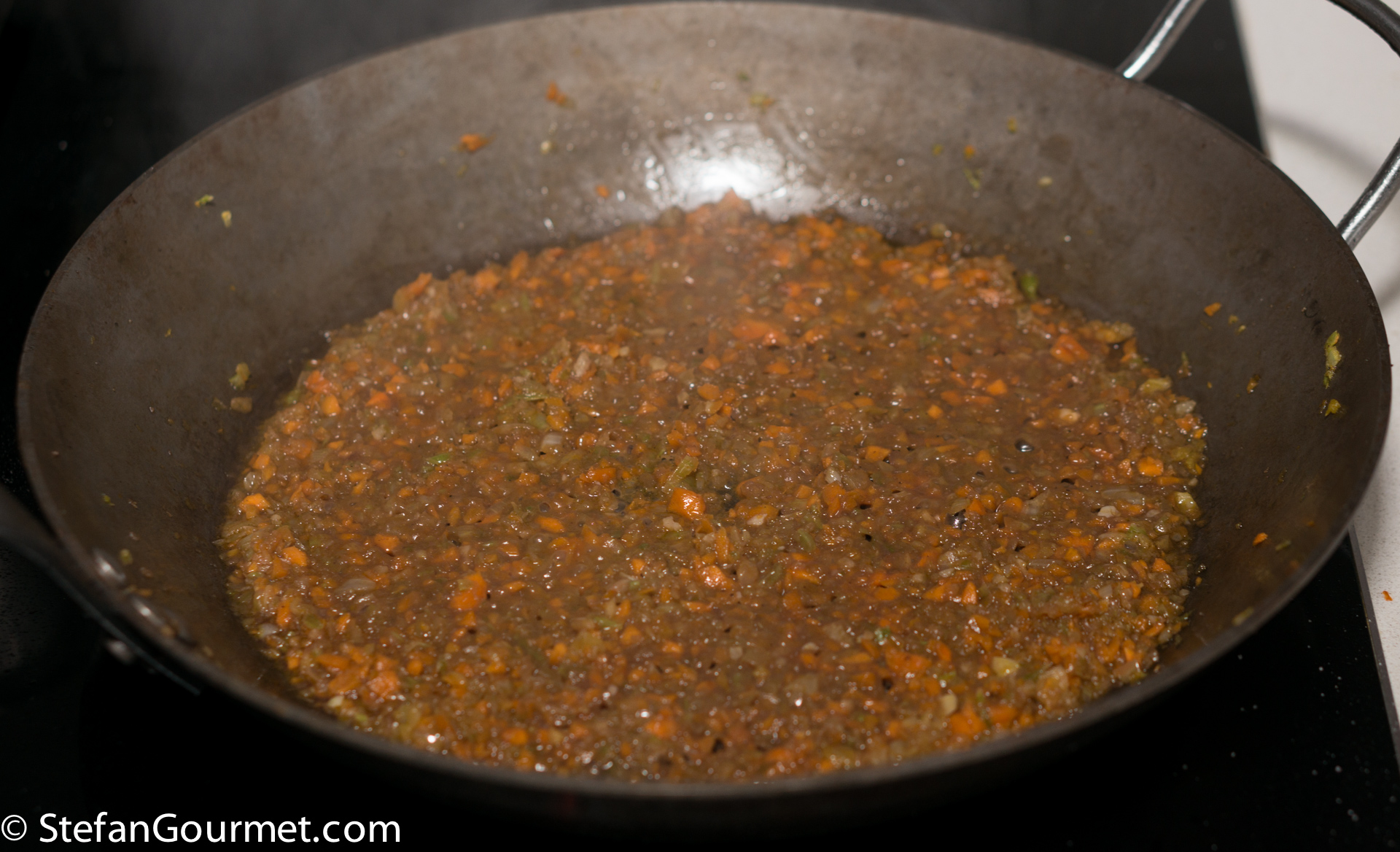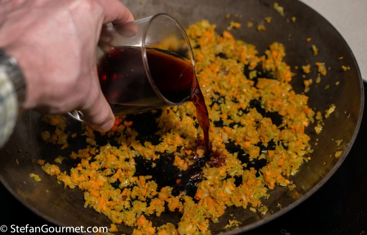 Stir over medium heat until the vegetables start to color, 5 to 10 minutes. Then deglaze with 80 ml of red wine.