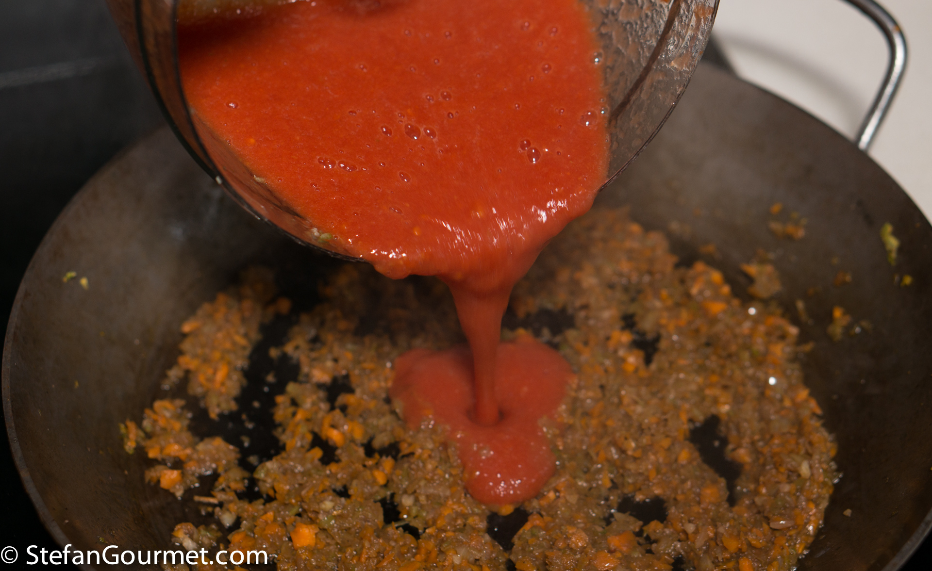 Puree the peeled tomatoes in the food processor and add to the vegetables.