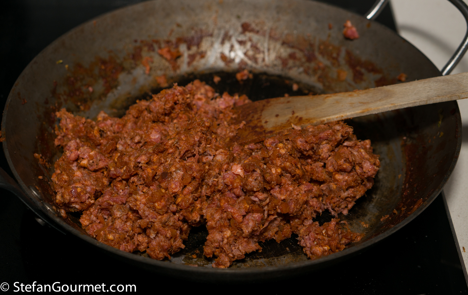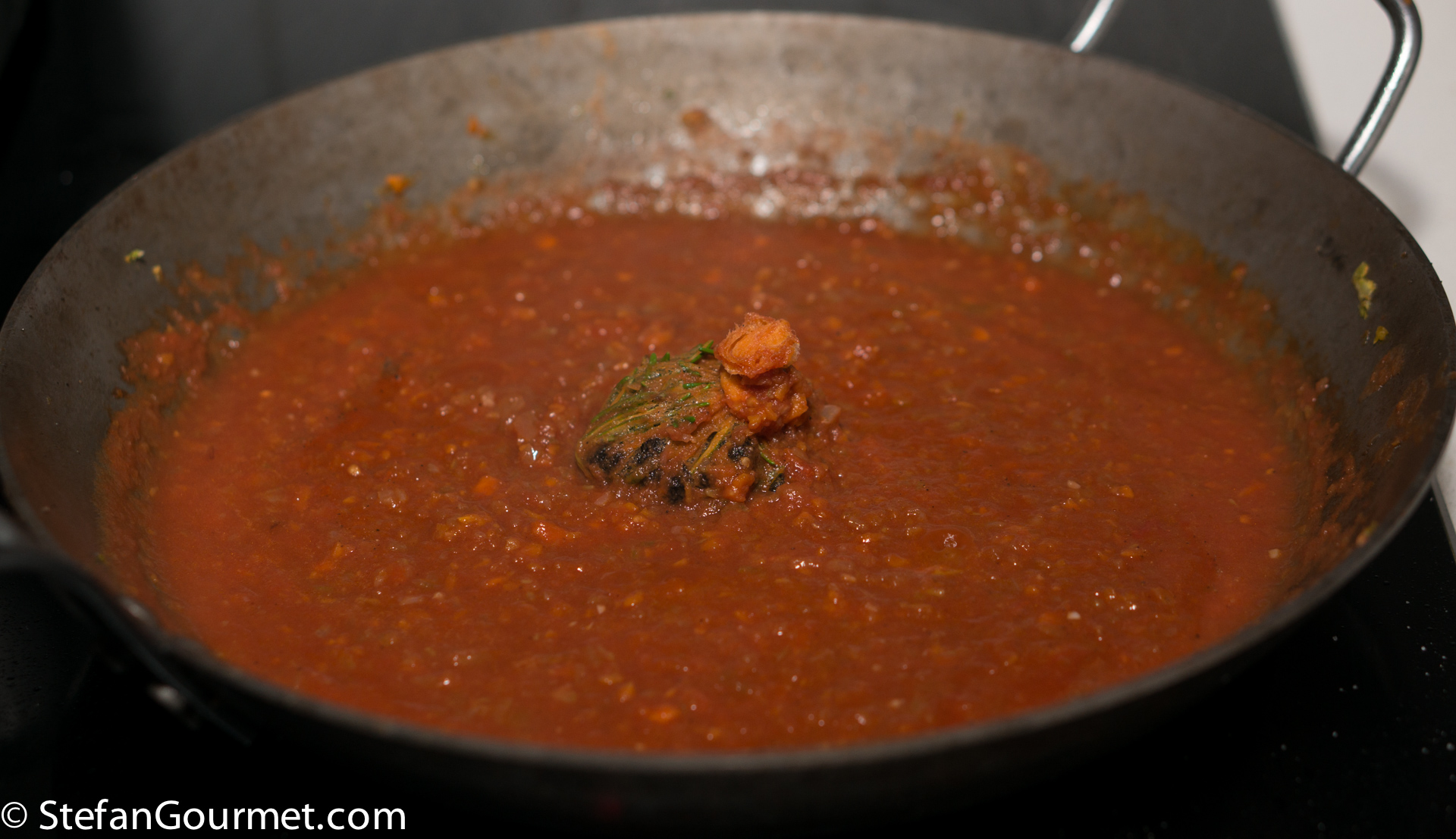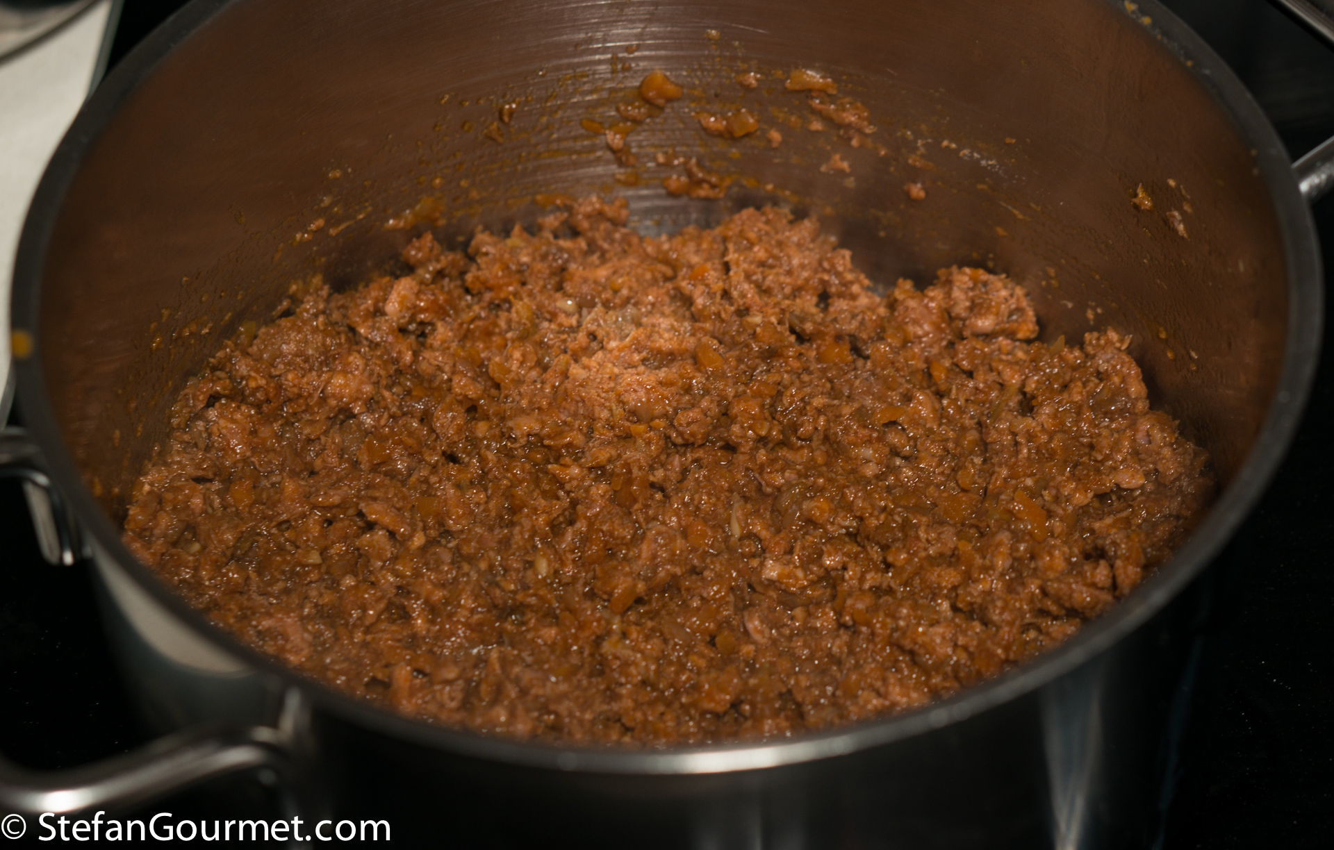 (If not cooking sous-vide, add the ground meat at this point. Then simmer the ragù over very low heat, preferably in the oven set to 85C/185F until it has the right consistency.)