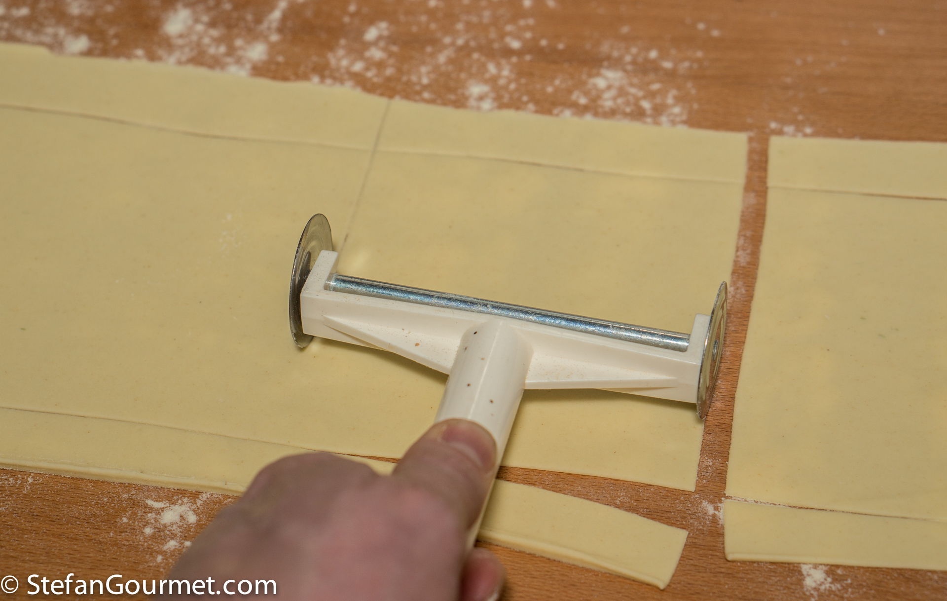 Make pasta dough using the flour, olive oil, and as much lukewarm needed (start with 80 ml or 1/3 cup and add little by little) to allow the dough to come together. The procedure is described in this post. Wrap the dough in cling film and allow it to rest in the refrigerator for at least half an hour. Then roll it out to the one but thinnest setting (i.e. setting “8” when the thinnest is “9”) and cut it into 10 cm (4″) squares.