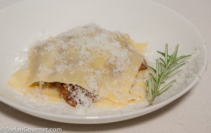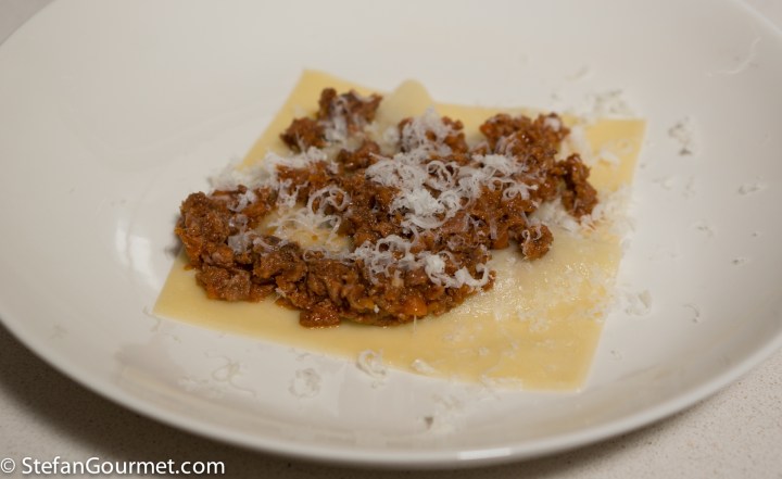 When we had dinner at Michelin-starred restaurant S’Apposentu in Sardinia (read about our experience there in my review), one of the dishes that I decided right away I wanted to try at home was an unbaked lasagna with a mutton ragù. The idea is quite simple: alternating layers of fresh pasta and ragù are served without the usual step of baking the lasagna in the oven. The version at the restaurant was made with egg pasta and included some green beans, but I thought it would be nice to keep it Sardinian with pasta made using semolina flour and water only, and to omit the beans. I used lamb and decided to cook the ragù sous-vide to give it a silky texture. The meat is browned before grinding it, which gives the best of both worlds: the flavor development from browning without the gritty texture. Together with the silky pasta this turned out to be an amazingly delicate and delightful dish that would be lovely to grace your dinner table during the holidays. The only drawback is that you have to work fast (and not serve too many portions), so the pasta and ragù don’t cool off too much while you assemble the lasagna. You could of course make the ragù without the use of sous-vide, but it will be difficult to obtain the same silky texture.