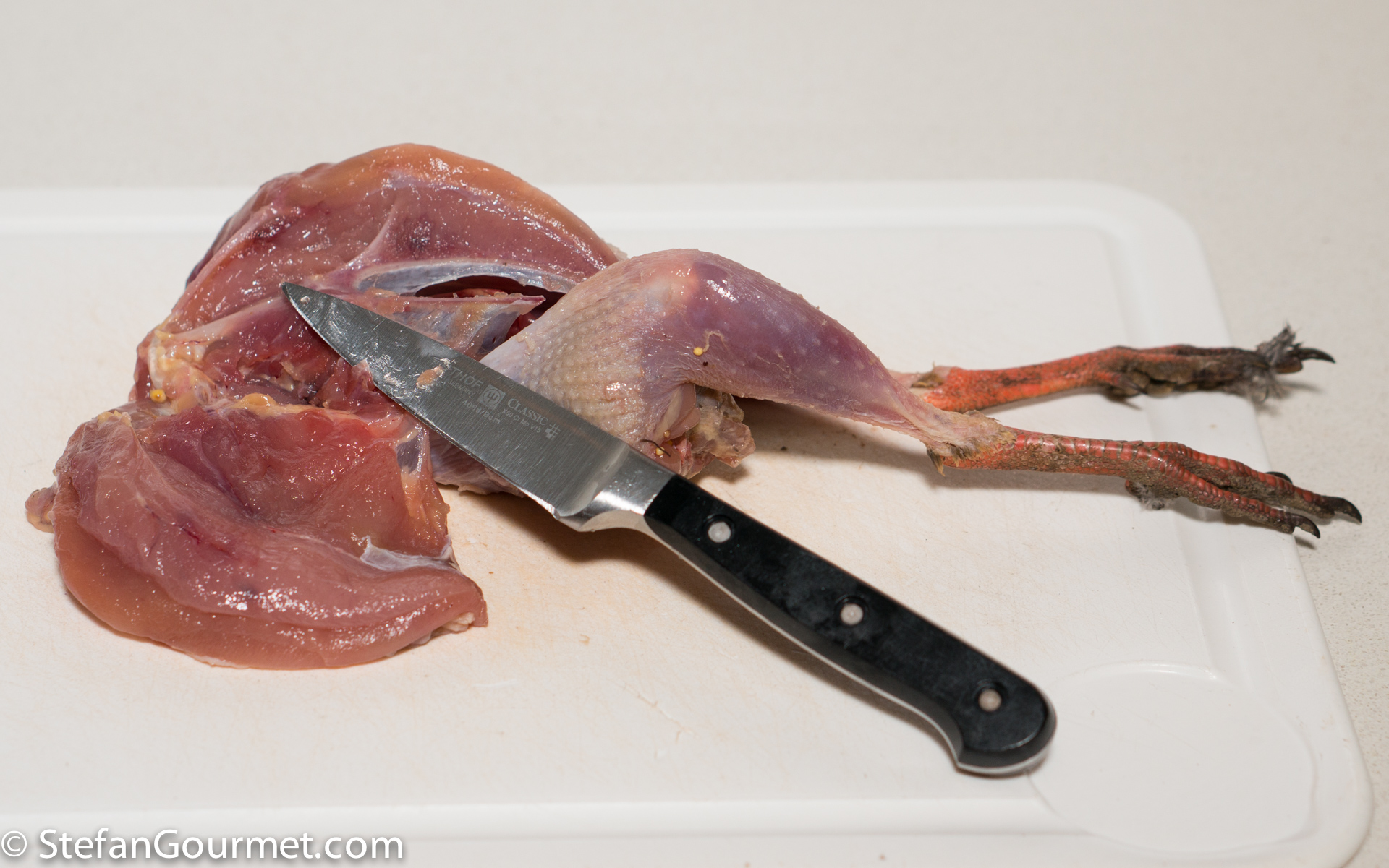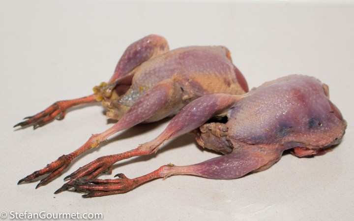 With a small sharp knife, cut the breast fillets and legs off the partridges.