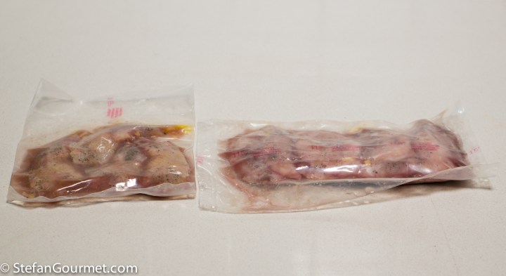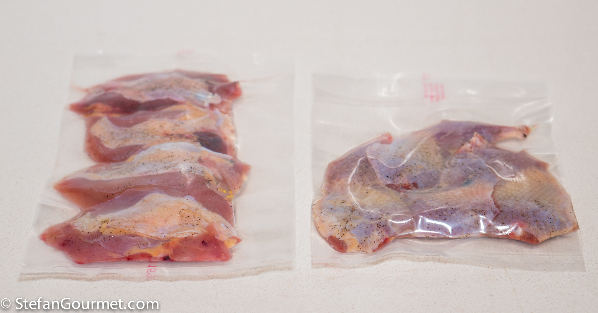 Season the breast fillets and legs with salt and freshly ground black pepper on both sides. Vacuum seal the breasts and legs separately.