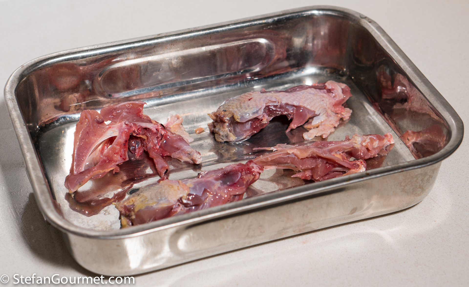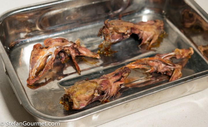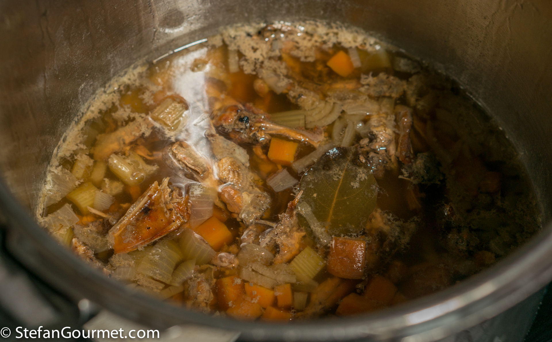Put the roasted carcasses in a stock pot or pressure cooker with 1/2 a litre (2 cups) of water, a baf leaf, and chopped onion, carrot, and celery. Bring to pressure and pressure cook for 2 hours, or bring to a boil and simmer gently for 4 hours.