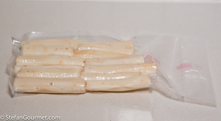 Season the salsify with salt, vacuum seal, and cook sous-vide for 1 hour at 88C/190F.