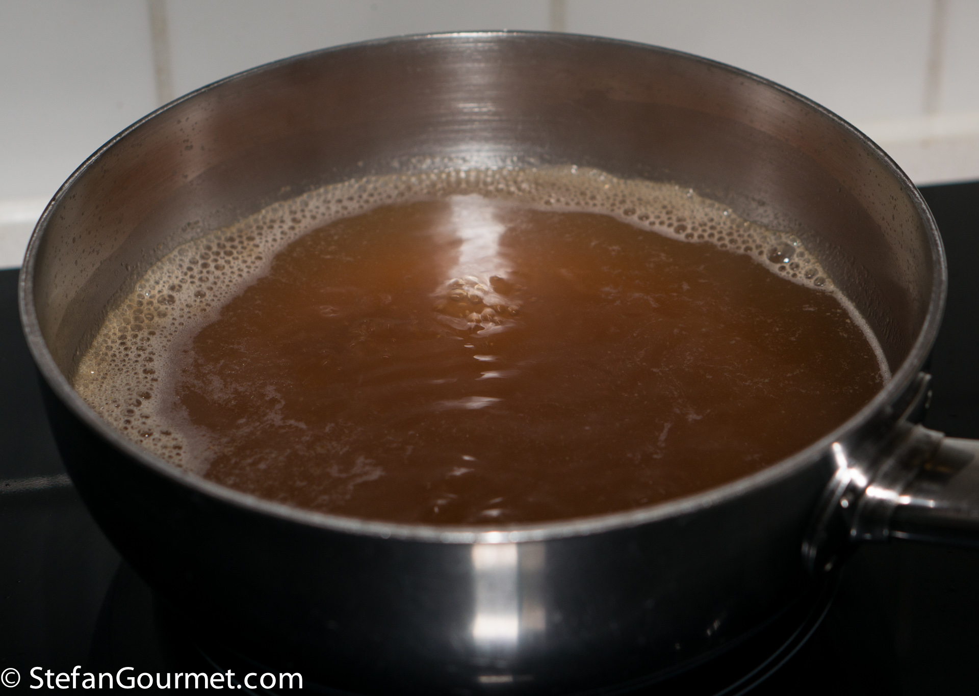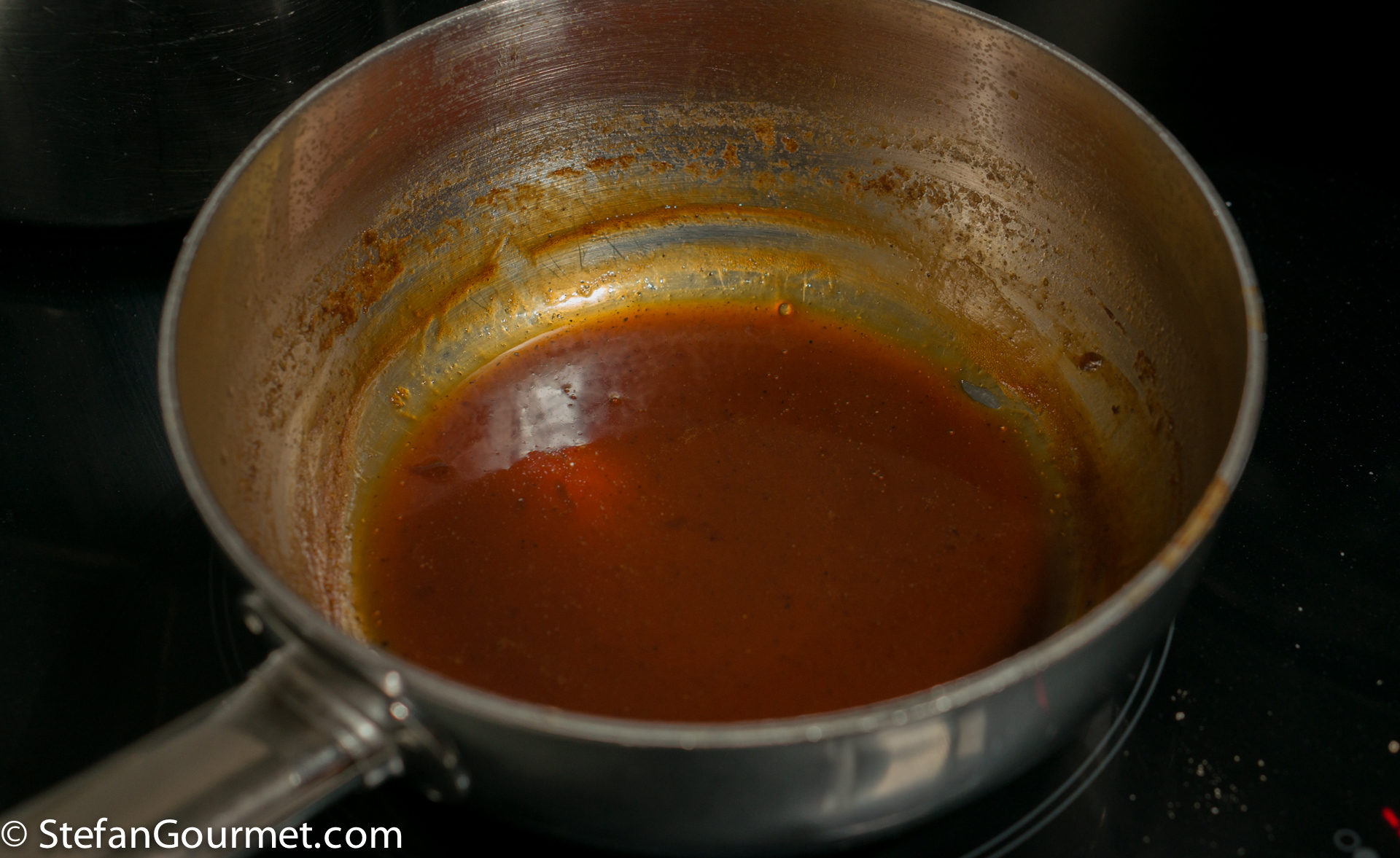 Simmer until reduced to about 80 ml (1/3 cup). Taste and adjust the seasoning with salt and freshly ground black pepper.