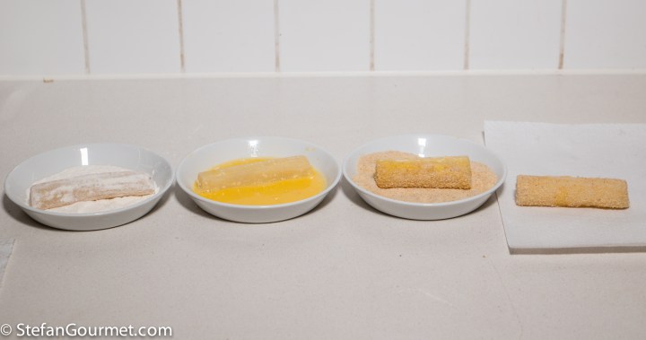 When the salsify have been cooked sous-vide, set up an assembly line. Pat them dry with paper towels, then dust them completely with flour. Dip them in beaten egg, and finally cover them with breadcrumbs.