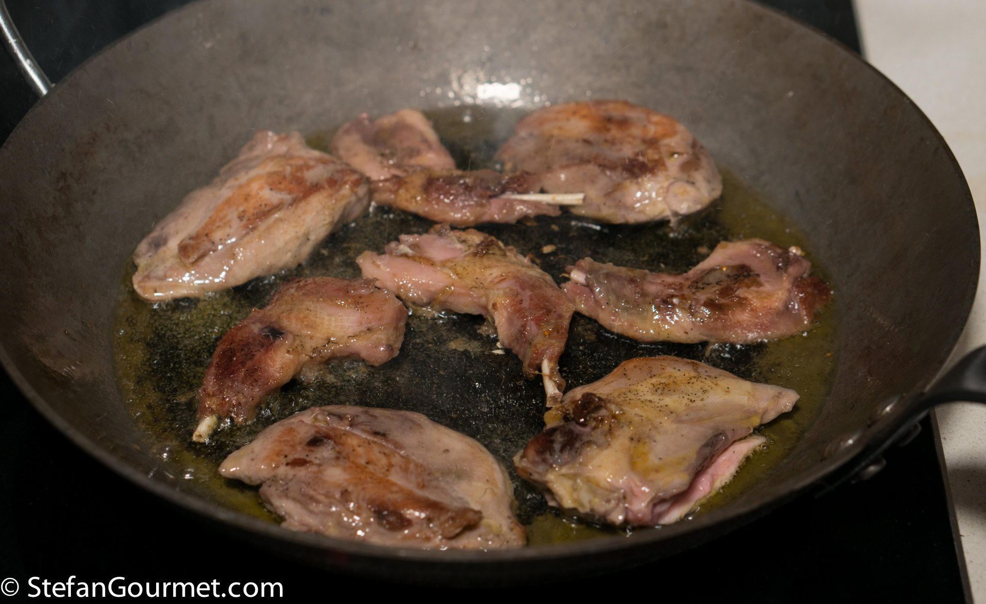 Deep fry the salsify while you brown the partridge. To do this, heat 2 tablespoons of olive oil in a frying pan and brown the partridge legs and breasts over high heat, no more than 30 seconds per side to prevent overcooking.