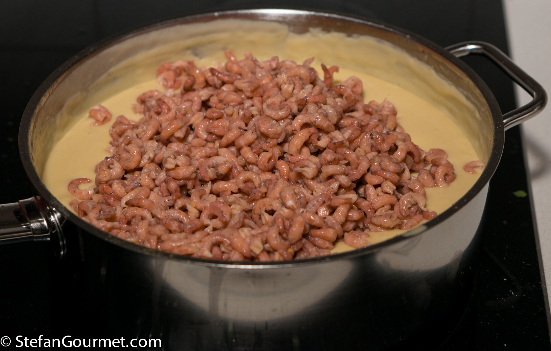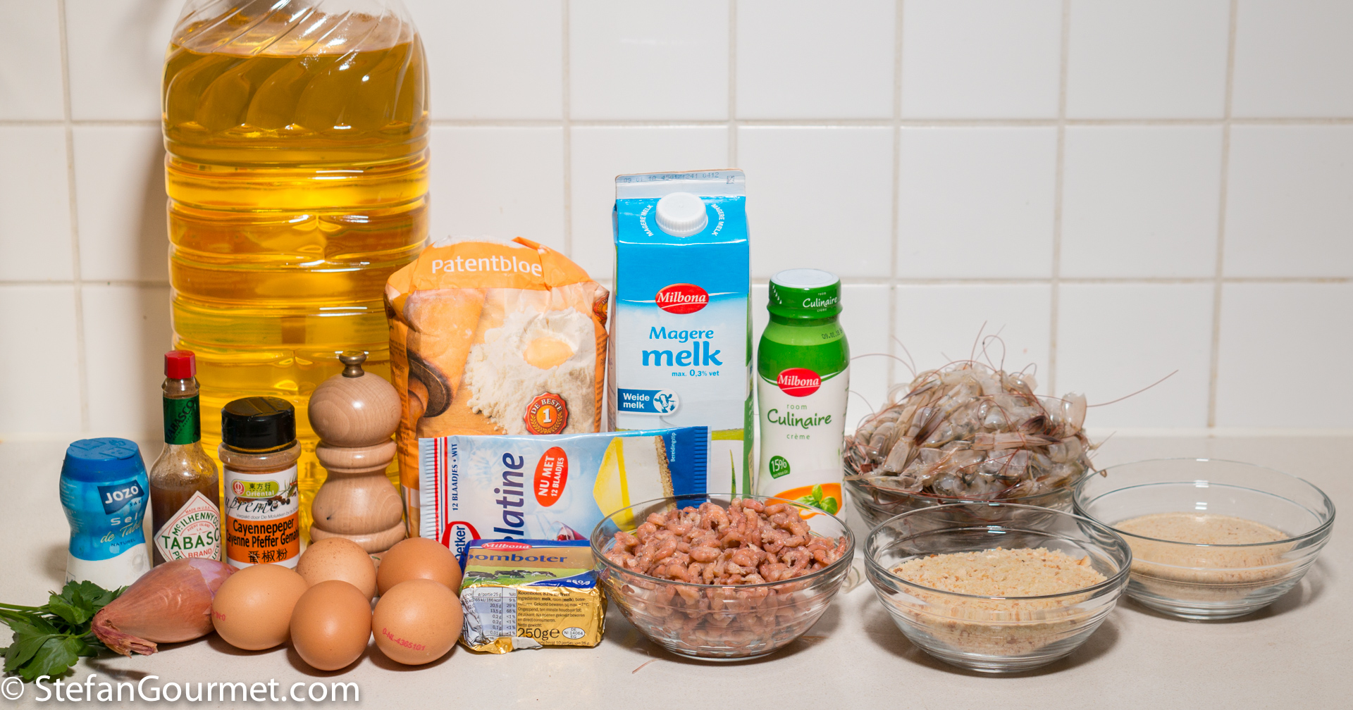 I used the recipe of retired pastry chef Cees Holtkamp. I made a few small changes, the most important being that I did bought already peeled small shrimp, and used shrimp heads and shells from my freezer. The secret to a crispy crust is to use two layers of breadcrumbs: the first layer with regular (fine) breadcrumbs, and a second layer with coarse breadcrumbs. In this post you can read how to make fine and coarse breadcrumbs yourself from old bread. You can also use panko for the coarse breadcrumbs.