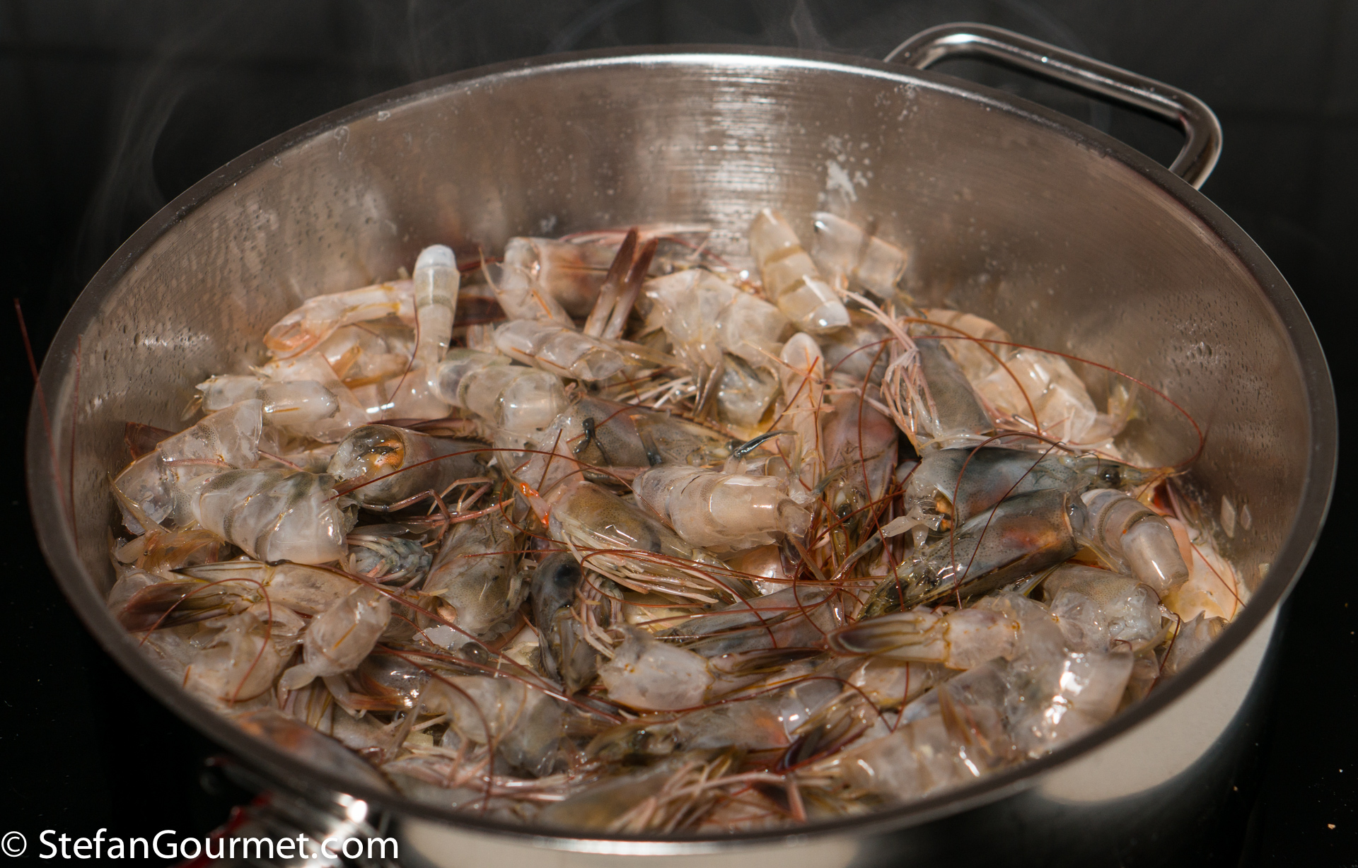 Stir over high heat until the shrimp heads and shells are pink all over.