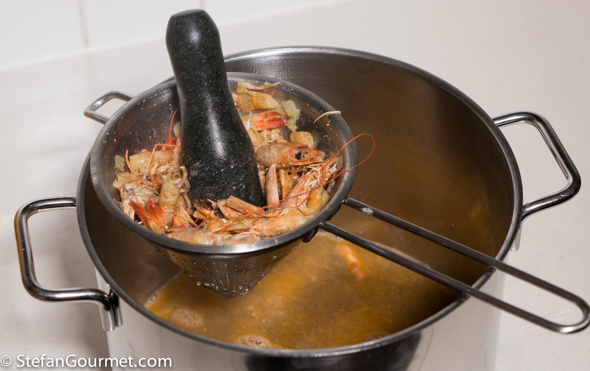 Sieve the stock, and get as much flavor and juice out of the shrimp heads and shells using a pestle and a chinois or sieve.