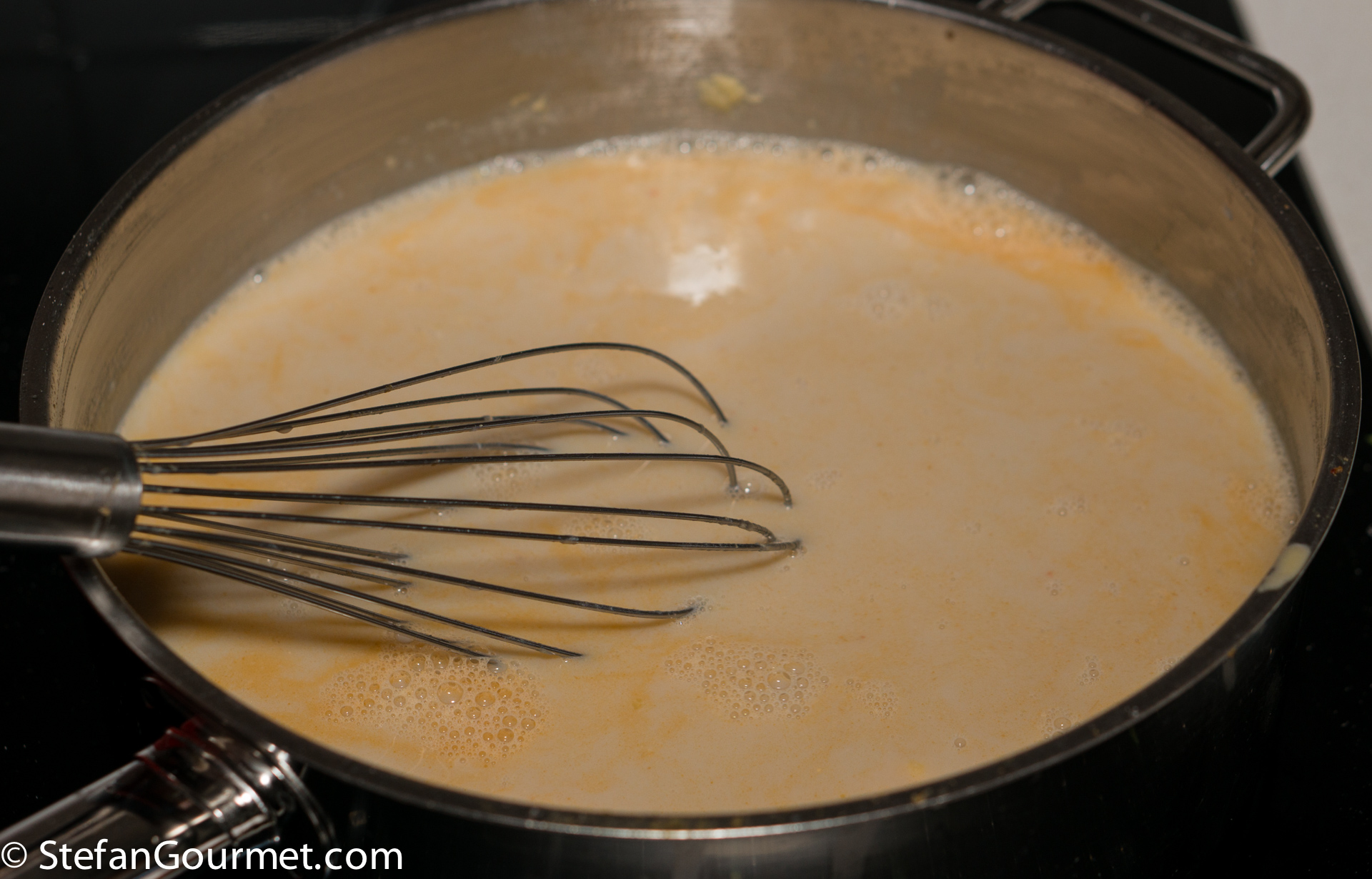 Now add the shrimp stock and milk mixture all at once. (Most recipes will tell you to add it slowly, but that is not necessary and even makes it more difficult. The temperature of the liquid doesn’t matter much either.)