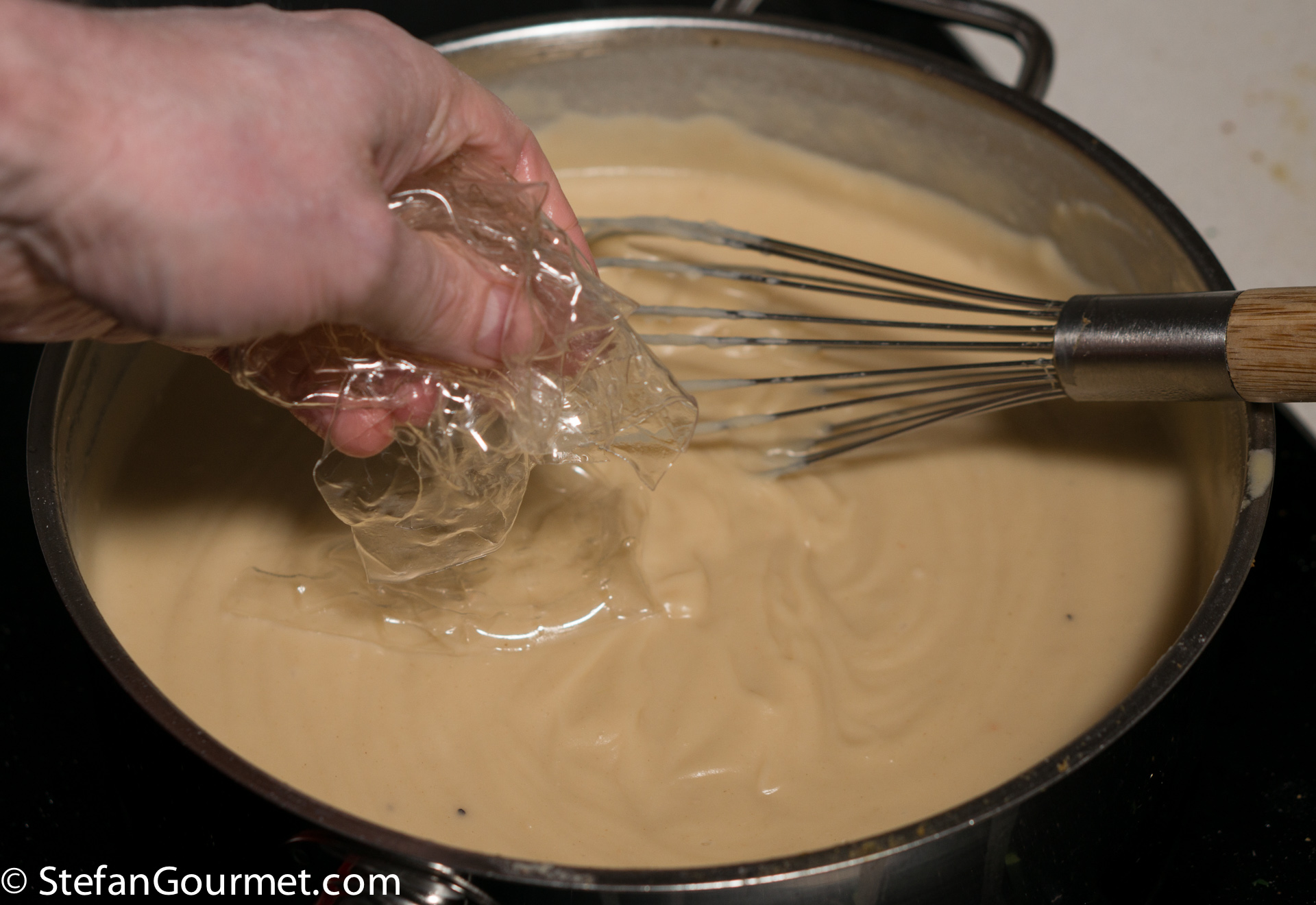Soak 6 grams of gelatin in cold water. (Gelatin comes in sheets here. I do not have experience with powdered gelatin, so follow package instructions for that.)