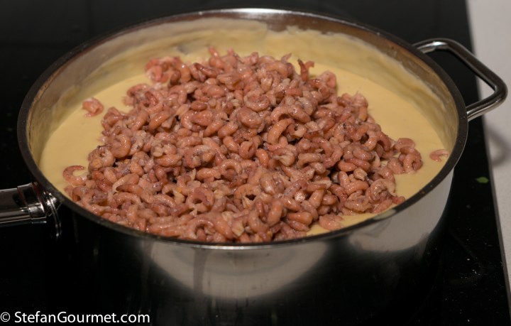 For real Dutch (or Flemish) shrimp croquettes, you will need the small shrimp that are caught in the North Sea. They are a pain in the (beep) to peel, but they have more flavor than their larger cousins. The shrimp are boiled in sea water as soon they are caught. You have the option to buy them like that, so you peel them yourself, or buy them already peeled. In both cases they are already boiled. To distinguish them from their larger cousins, they are called Hollandse garnalen (Dutch shrimp) here. In French they are called crevettes grises (grey shrimp). If these small shrimp are not available to you, you can also make this with regular shrimp. Just make sure you buy shrimp with heads and shells, as you will need those to make the shrimp stock. This is what gives the ragoût its flavor. I’ve seen recipes that use fish stock instead, but it is not the same. Gelatin is used to make the ragoût firm enough when it is cold to shape the croquettes. When it is hot the ragoût will be liquid again, so the croquettes will be runny (as they should be).
