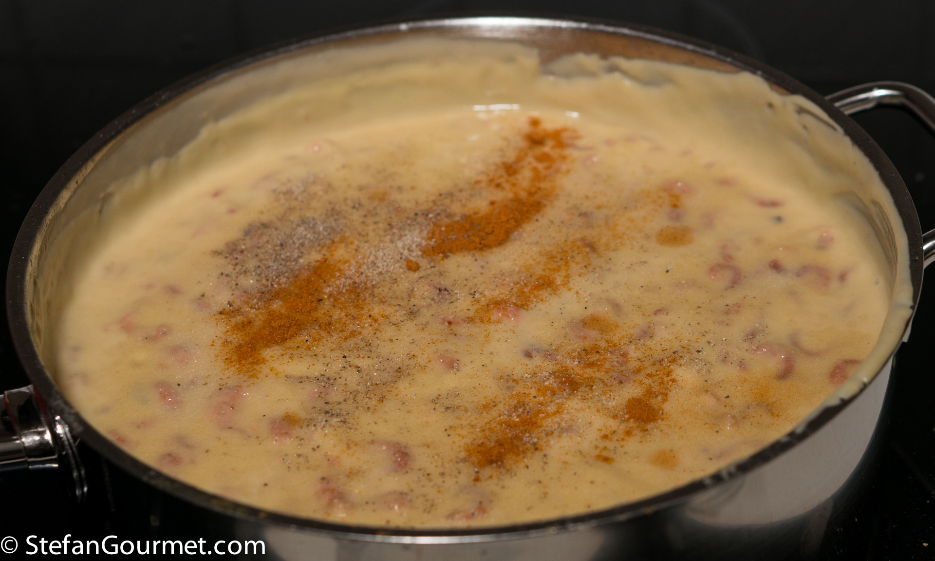 Season to taste. I used 3/8 tsp white pepper, 1 1/2 tsp salt, 1/8 tsp cayenne pepper, and 6 drops of tabasco.