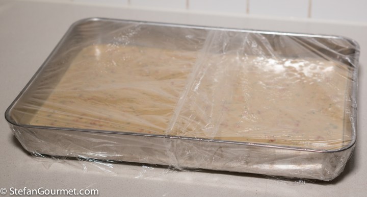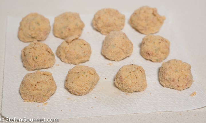 Allow the ragoût to cool and firm up overnight in the refrigerator. I transferred it to a wide rectangular dish to make it easier to divide the ragoût into equally sized balls.