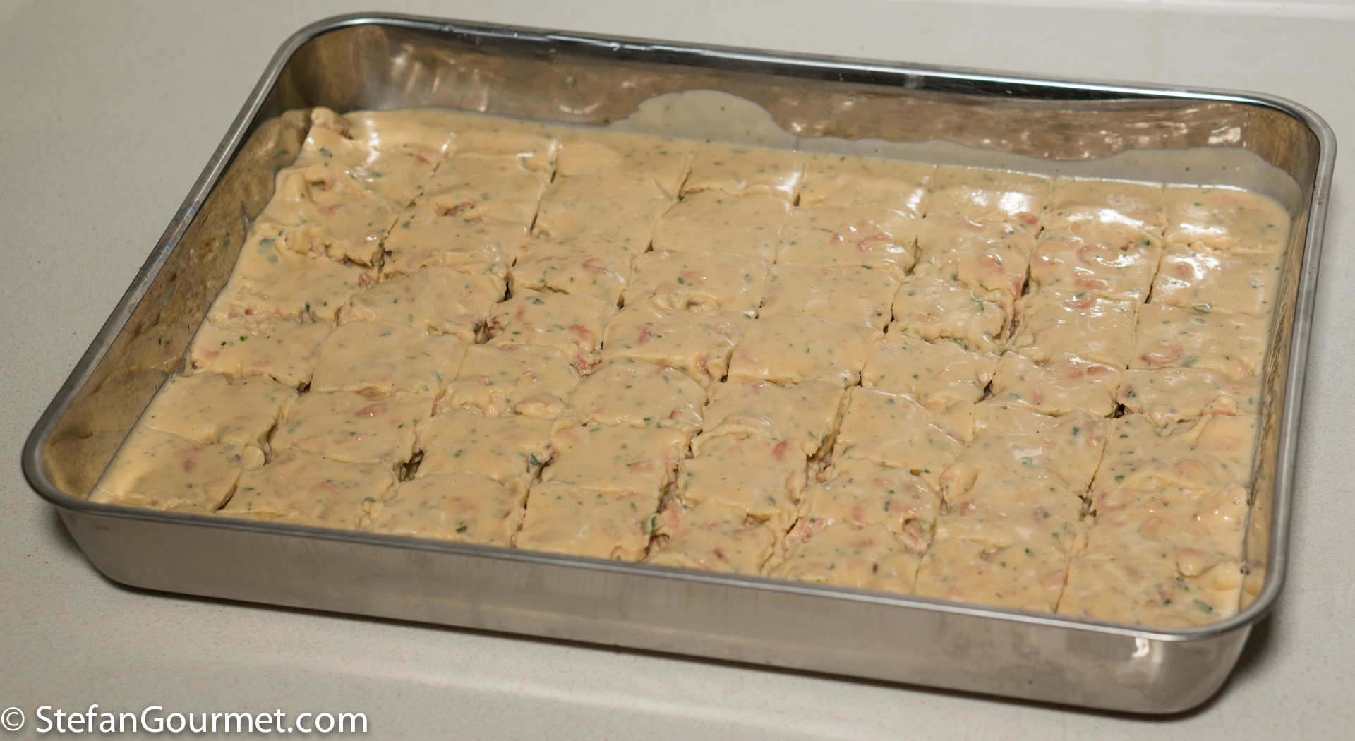The next day, the ragoût should have firmed up. Now you can easily divide it into 32 equal pieces for balls or 16 for croquettes using a knife. (Note that I made a double batch of 64.)
