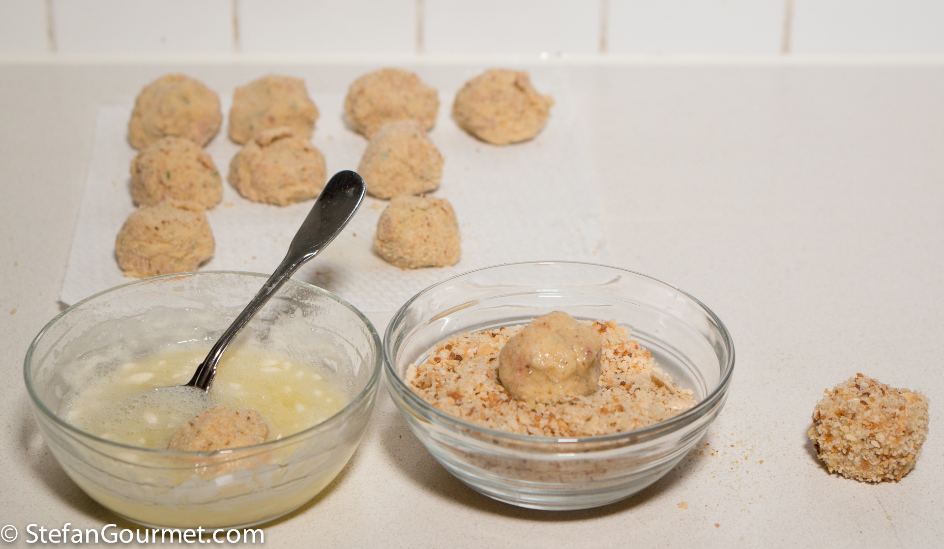 Dip each ball first in the egg white mixture, making sure to cover it completely, and then in the coarse breadcrumbs, again making sure to cover it completely. Otherwise there will be leaks when you deep fry.