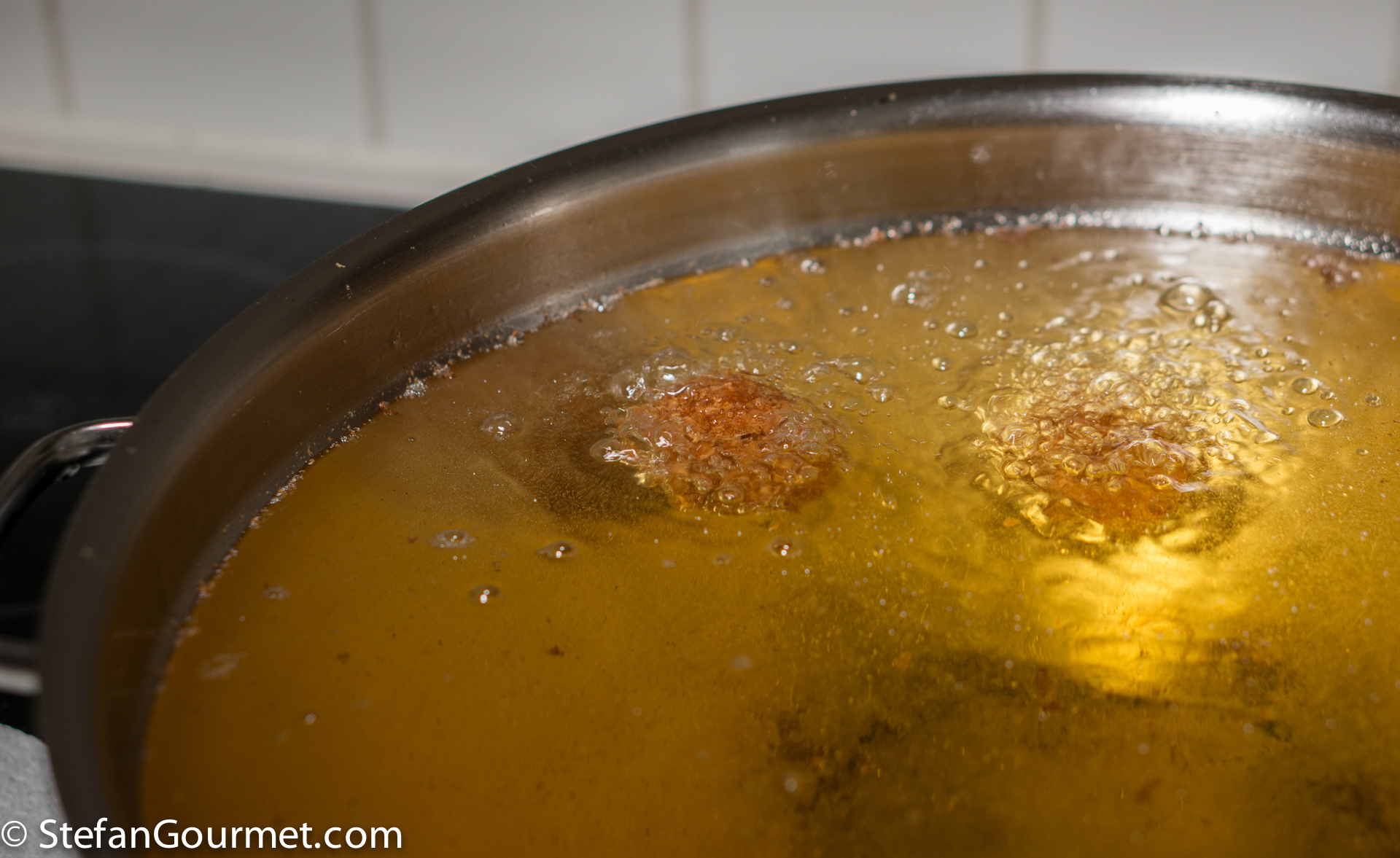 When the oil is hot, gently lower the balls into the oil. Do not fry too many at once, as otherwise the oil temperature will drop by too much.