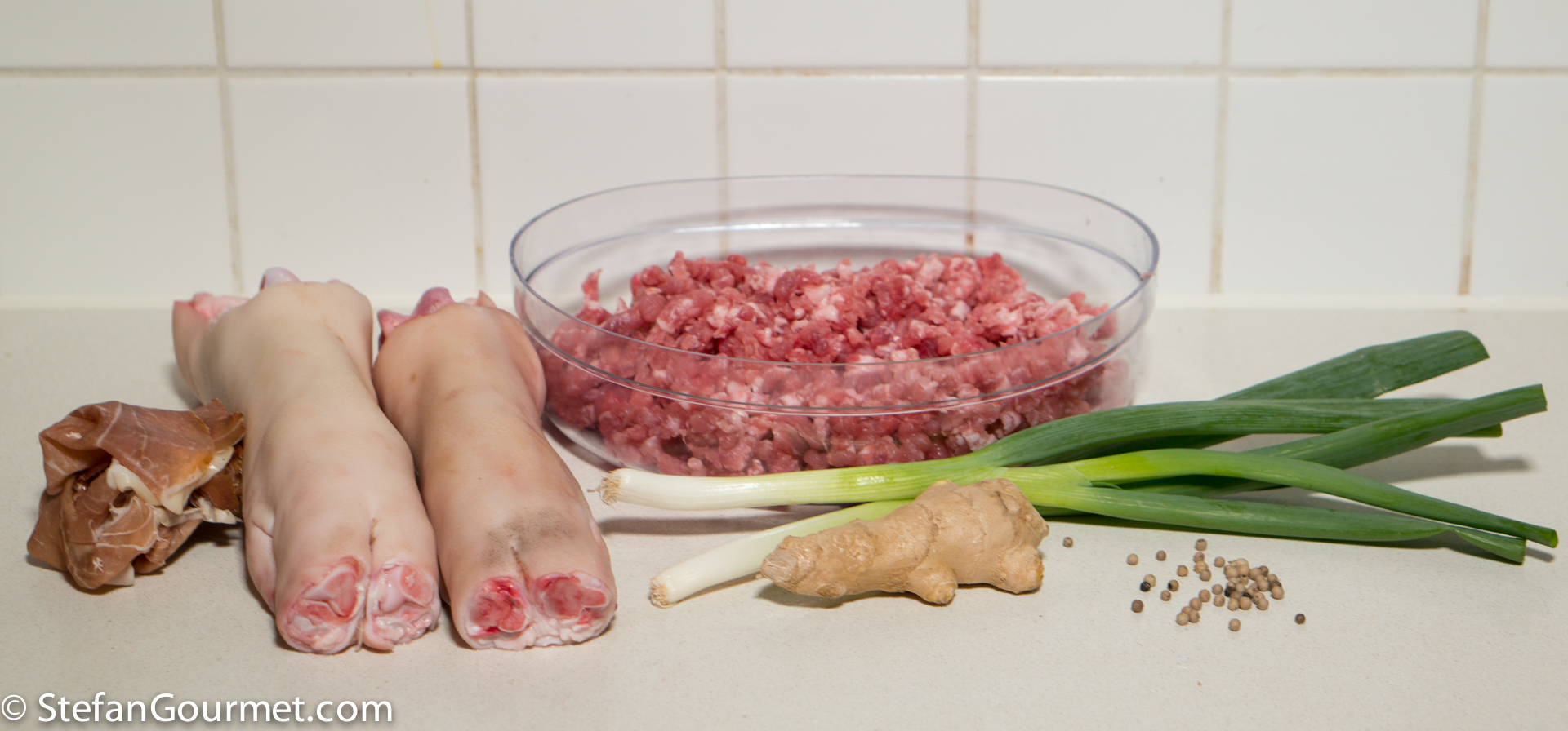 I’ve used some online recipes for inspiration, but all of them depend on adding gelatin to the soup. By using pork trotters, there will be plenty of gelatin in the soup, so there is no need to add powdered gelatin. It is best to make the soup the day before, so you can allow it to cool and remove the fat that will float on top before reducing the soup to concentrate the flavor.