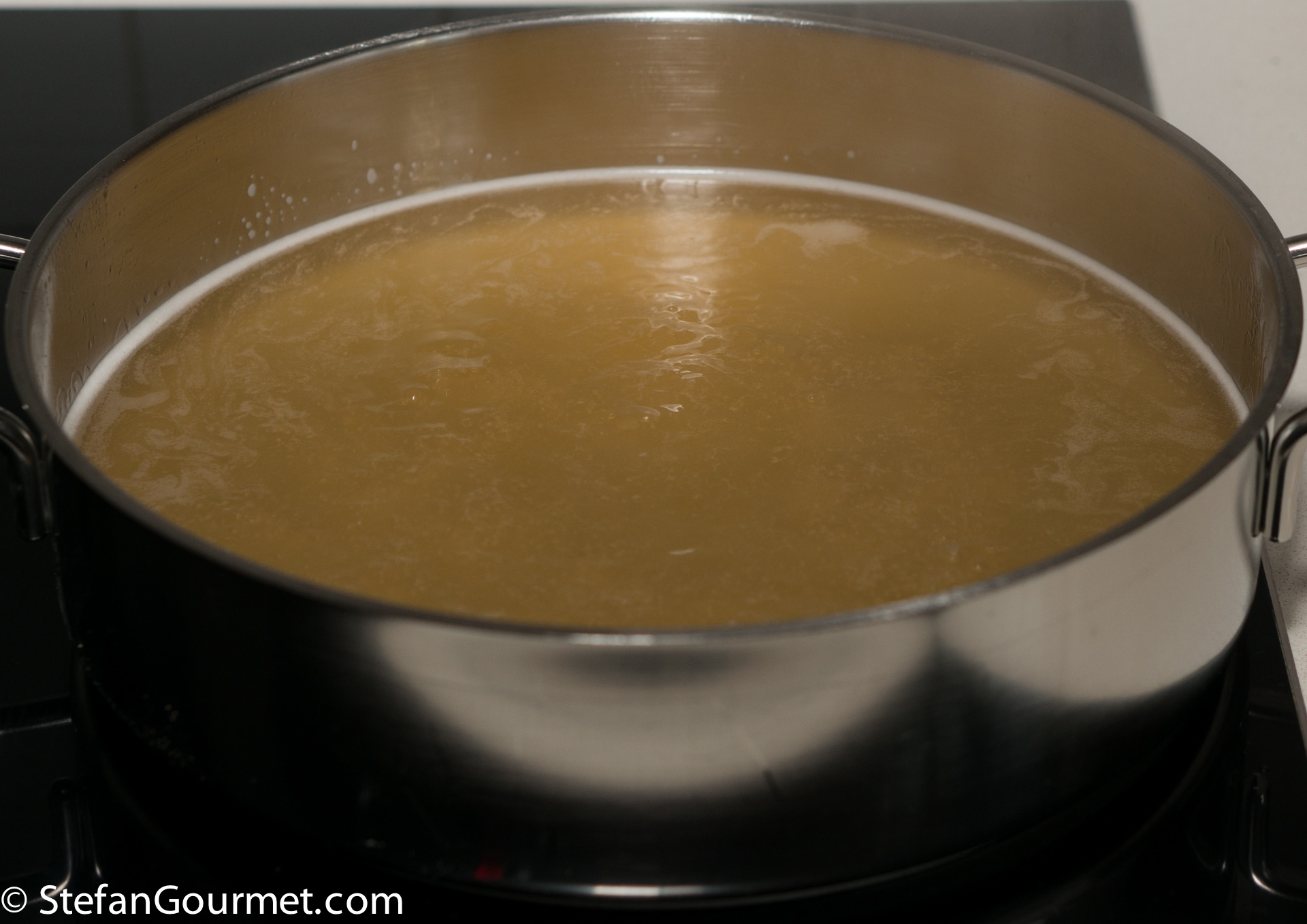 Put the stock in a wide pan, bring it to a boil, then reduce over medium heat to about 360 ml (1 1/2 cups).