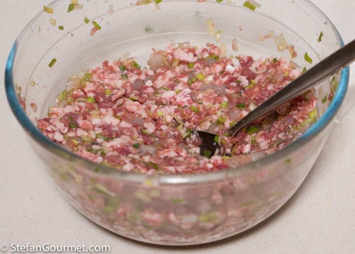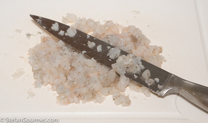 Meanwhile, prepare the filling. Start by mincing the shrimp.