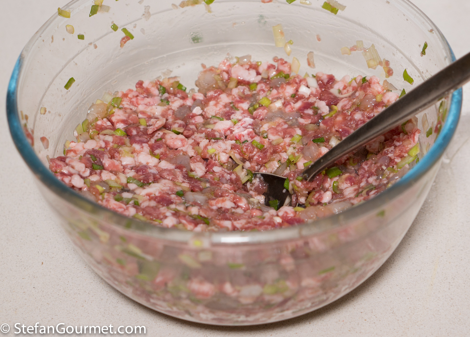 Mix the minced shrimp with the ground pork, minced green onions, sugar, salt, soy sauce, white pepper, grated ginger, shaoxing rice wine, and sesame oil. Stir well.