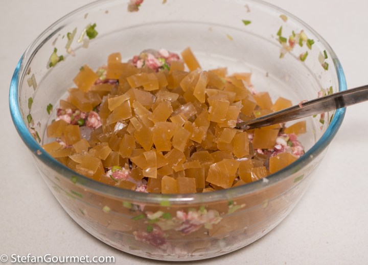 Dice the gelatinized soup. Many recipes tell you to mix this into the filling…