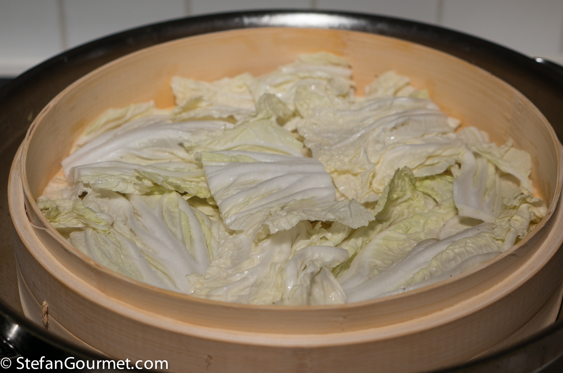 Cover the bottom of a steaming basket with a single layer of Chinese cabbage. Put this over simmering water for about 2 minutes to soften the cabbage and heat up the steamer.