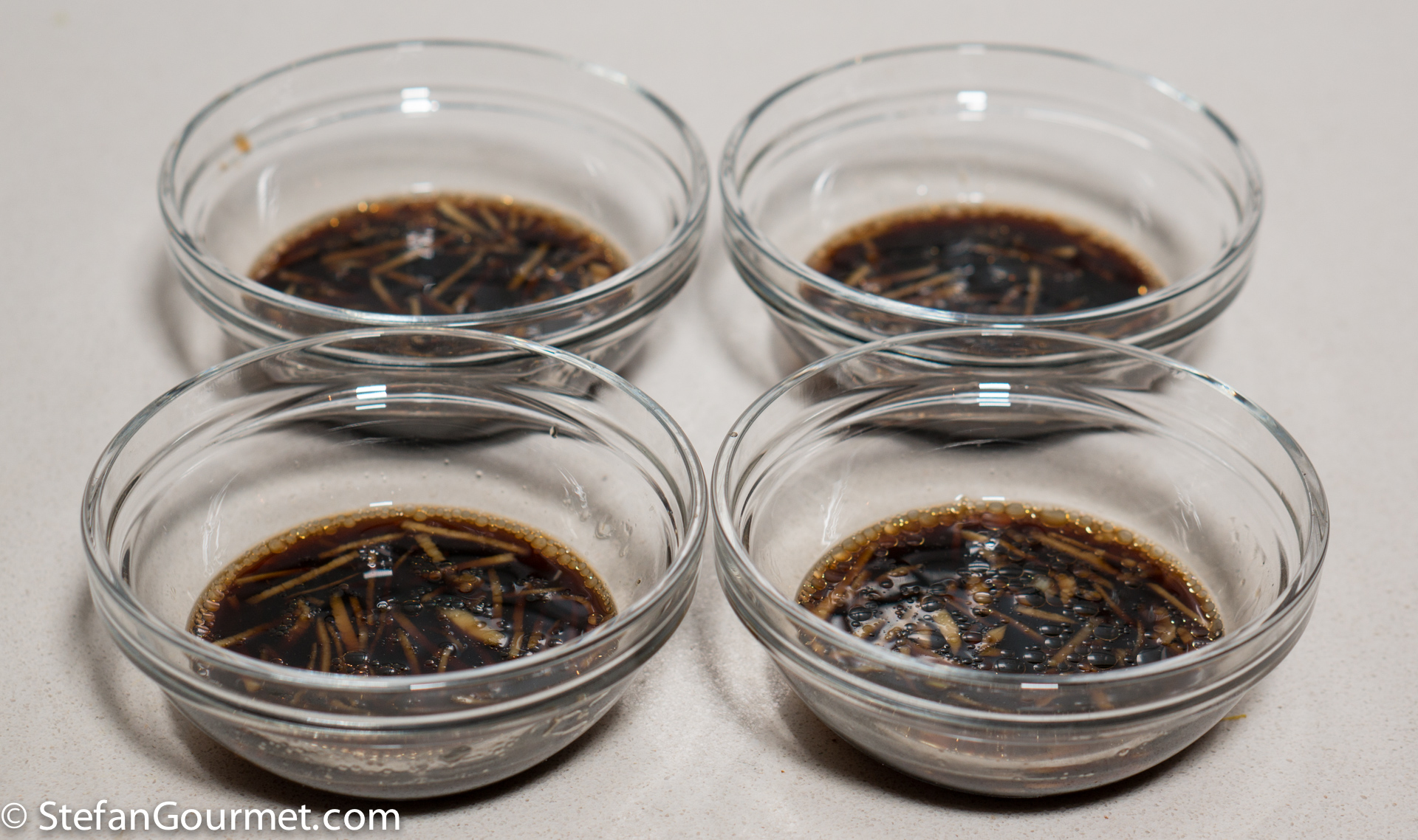 Meanwhile, make the dipping sauce by mixing black vinegar, soy sauce, ginger, and sesame oil.