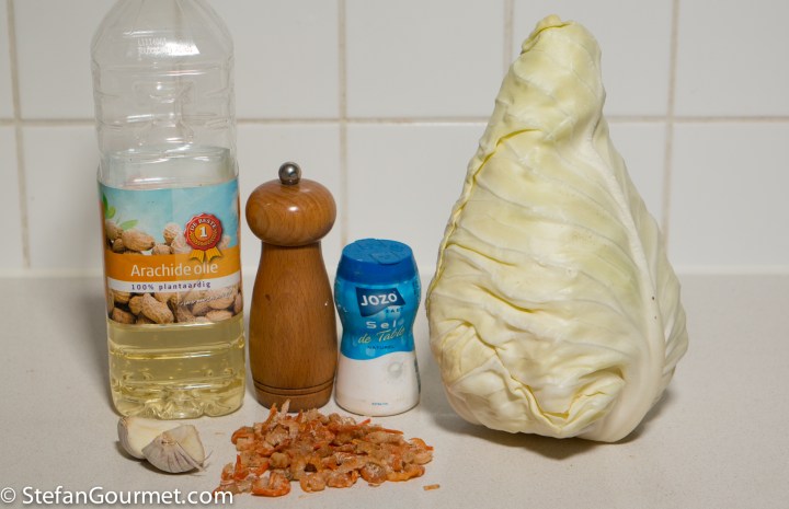 Whenever we tried vegetables in restaurants in Taiwan, they were always prepared quite simply: stir cooked (first stir fried and then steamed by adding water) with garlic and sometimes some additional ingredients like ginger, chilli, tiny shrimp, or a bit of pork. We usually selected the vegetable by pointing at it, and we were always happy with how it was cooked. I am not usually a huge fan of cabbage, but stir cooked such that it still has some bite and with garlic as well as tiny shrimp, it was very good. Those tiny salted shrimp are often used in Taiwanese cooking. They are so small that you can eat them whole, without peeling, and they provide flavor as well as texture.