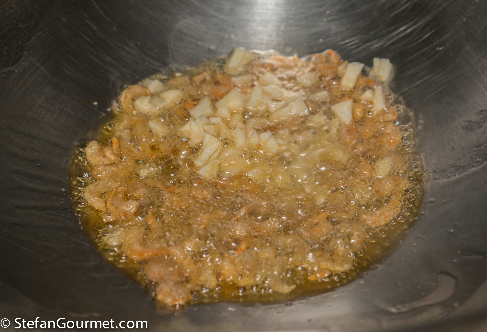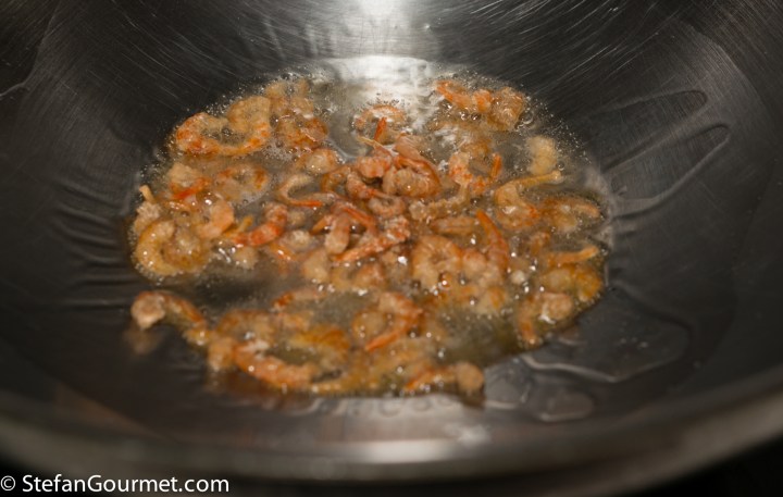 Heat 3 tablespoons of oil in a wok or frying pan. Add the tiny shrimp and stir fry for about 30 seconds.