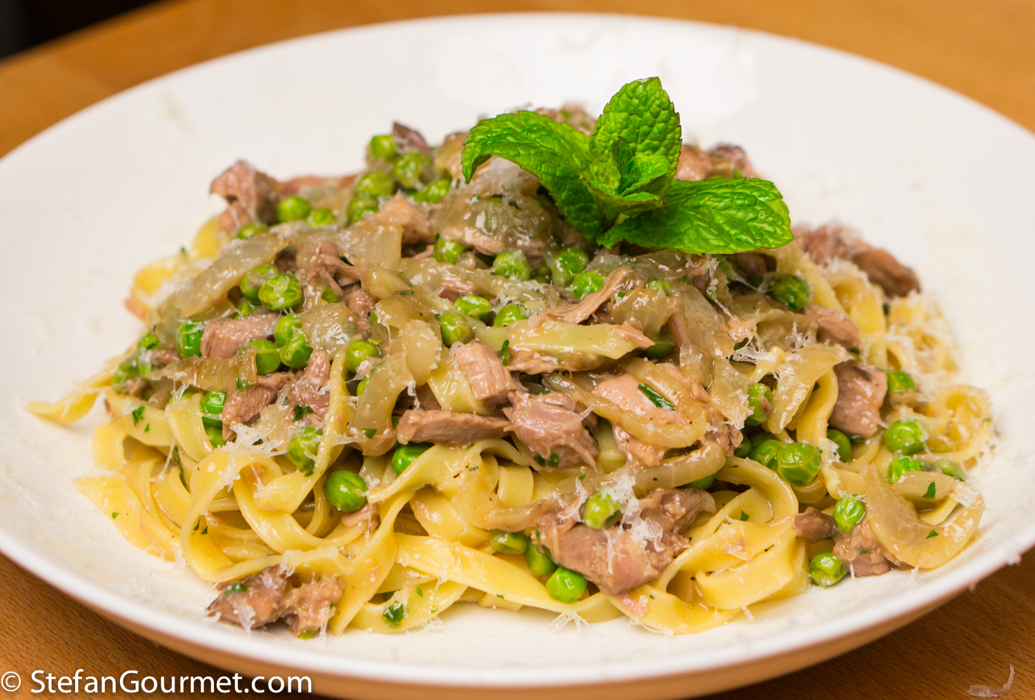 Two years ago I did the same type of food blogging as today: thinking of a dish, cooking it, eating it, and blogging about it, all in a single day. In this case it was pasta with lamb, peas, and mint.
