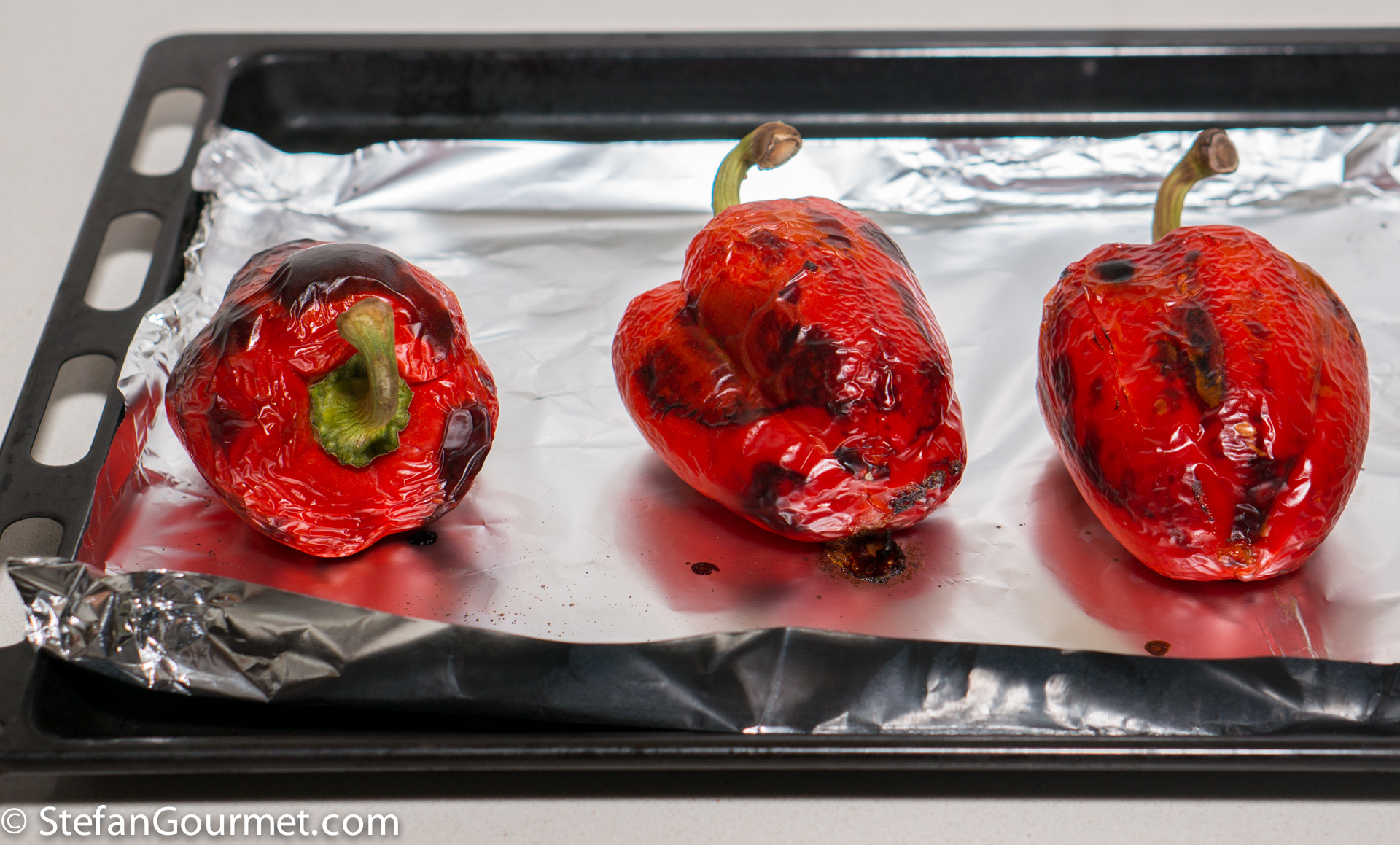 Start by roasting the bell peppers for about 20 minutes in a very hot oven (250C/480F) or until they are blistered and starting to blacken.
